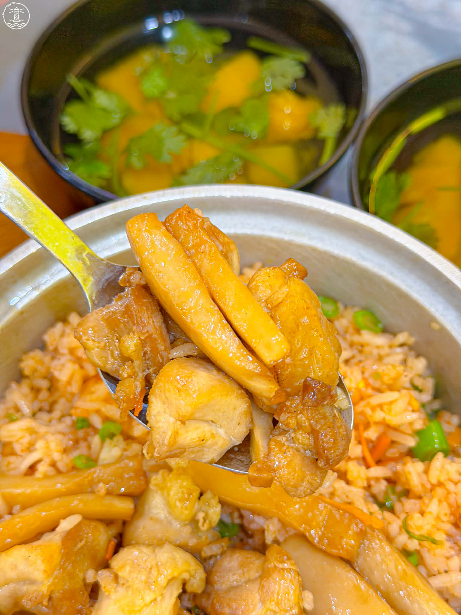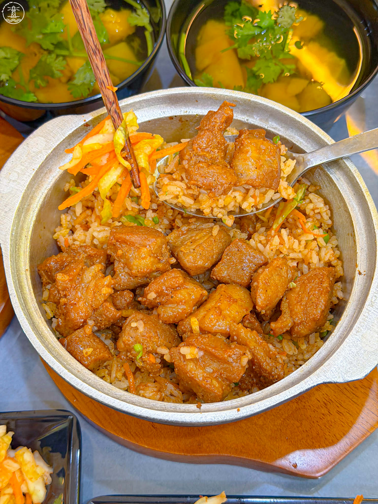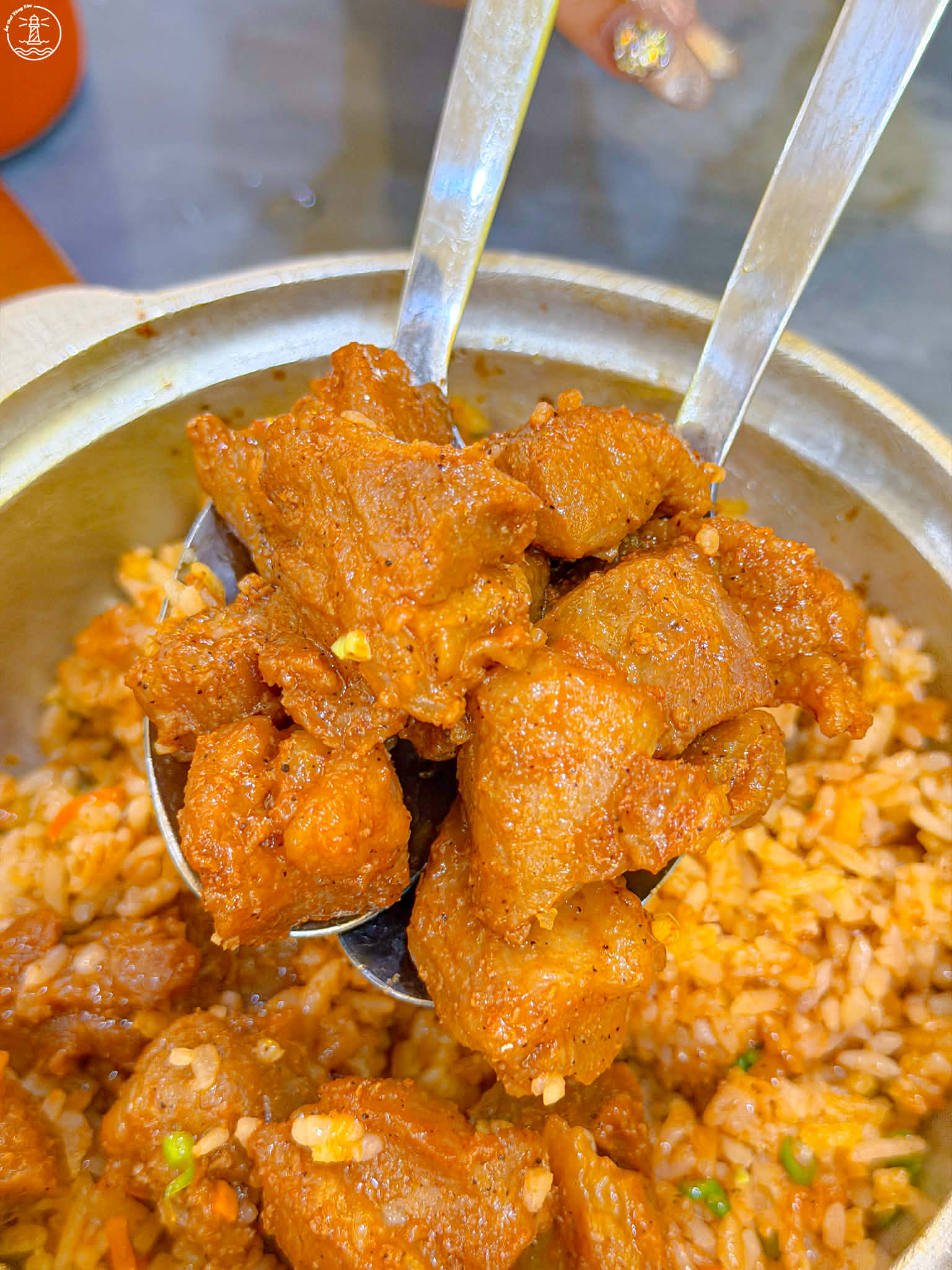 Quán có 2 món cơm: cơm chiên đảo bếp hạt rời có kèm hạt cơm cháy ăn bắt vị và quán có cơm trắng nữa ngen