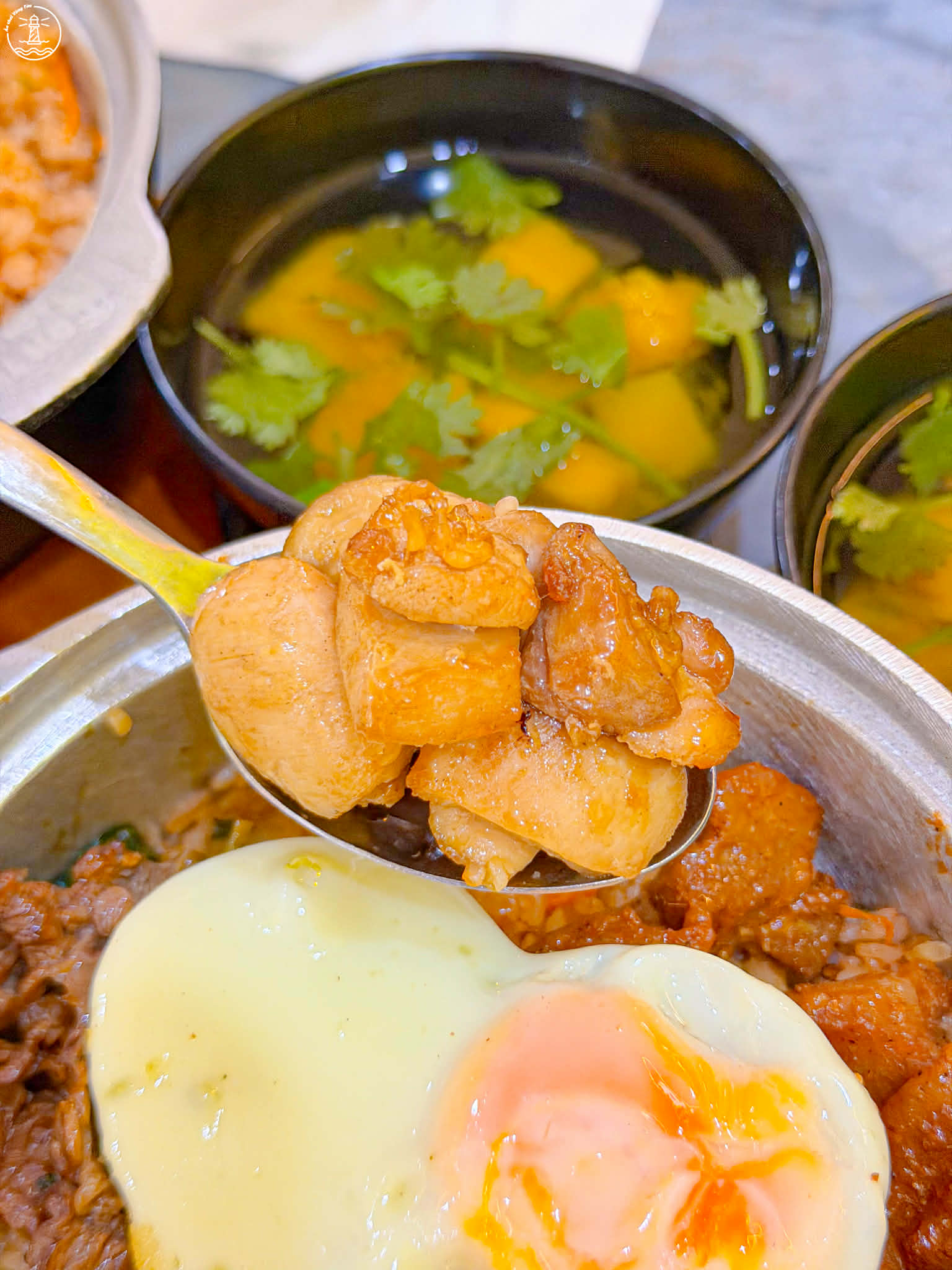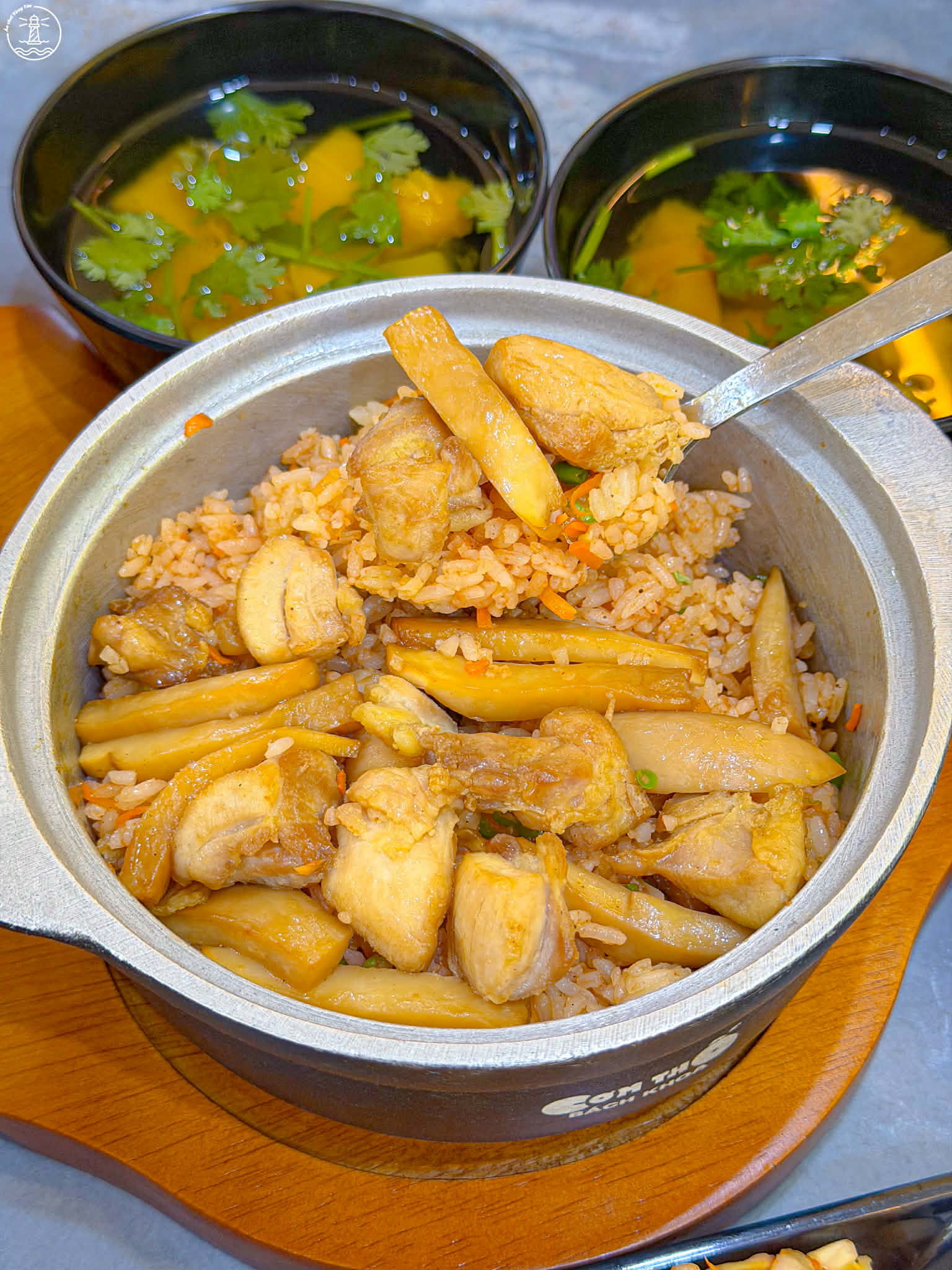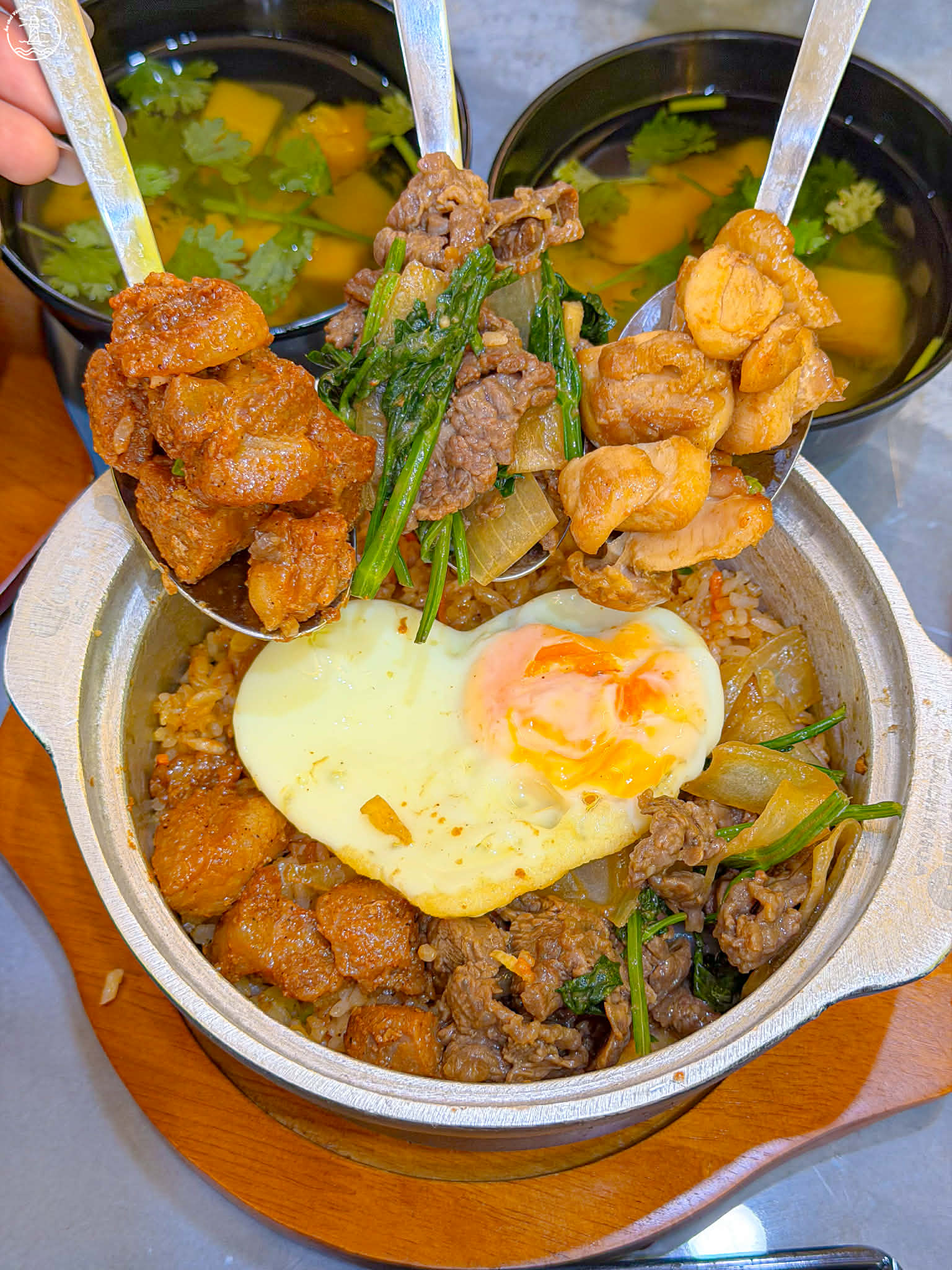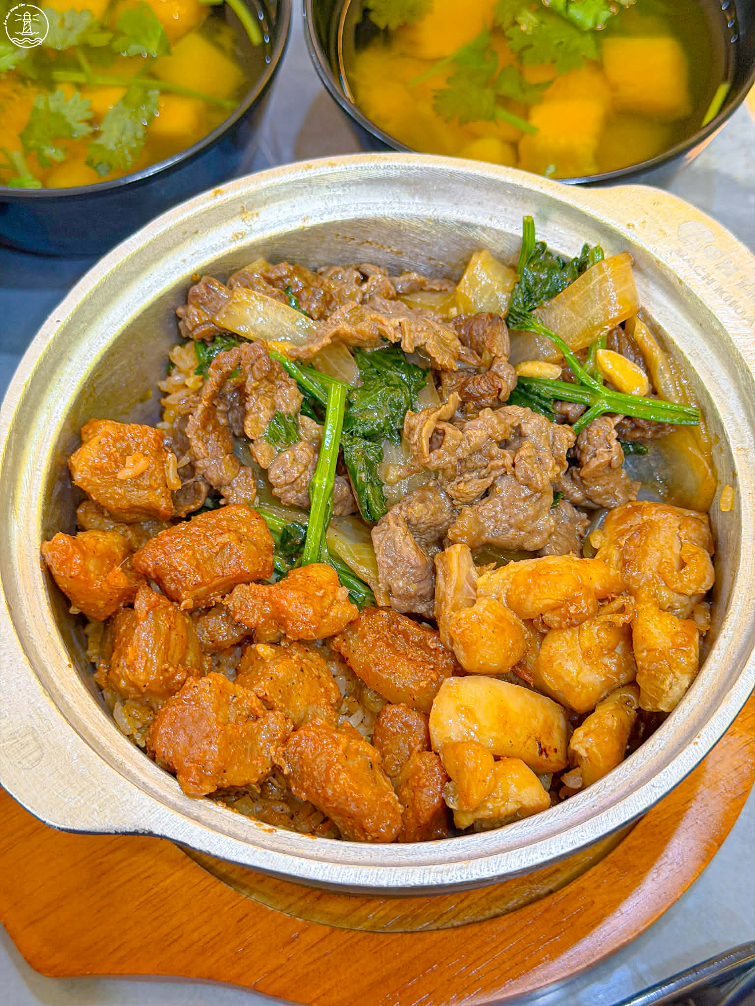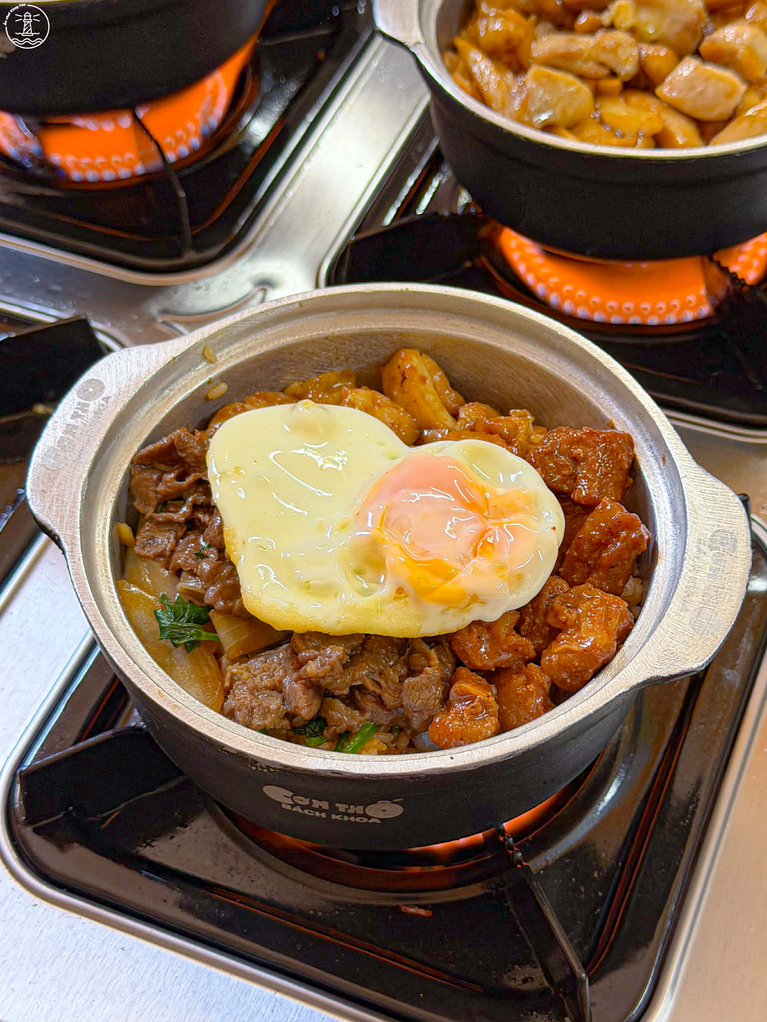 • Cơm thố đặc biệt (size M ~75k): phần đặc biệt siêu nhiều topping có tận 3 món lận nha. Thịt xá xíu, gà xào nấm và bò xào cần hành. Topping đầy ắp gu bà nào thích nhiều đồ ăn cứ quất ngay phần đặc biệt nha.