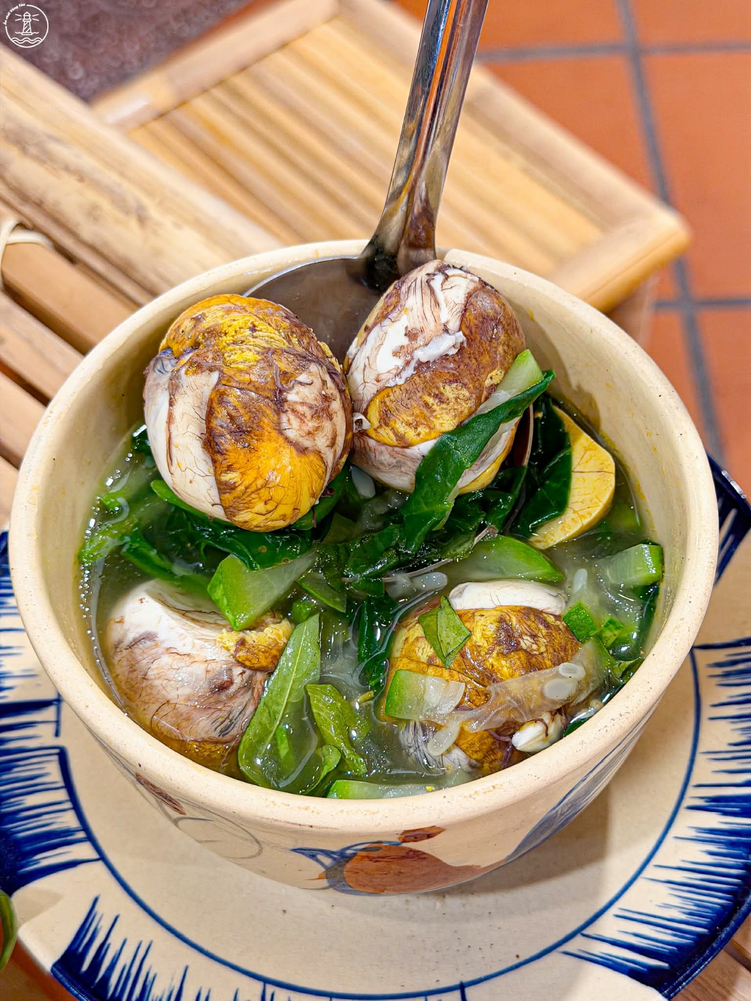 Trứng vịt lộn béo bùi, bầu và rau mồng tơi mềm và ngọt tự nhiên nên nước soup đậm đà. Món này ăn nóng sẽ rất ngon