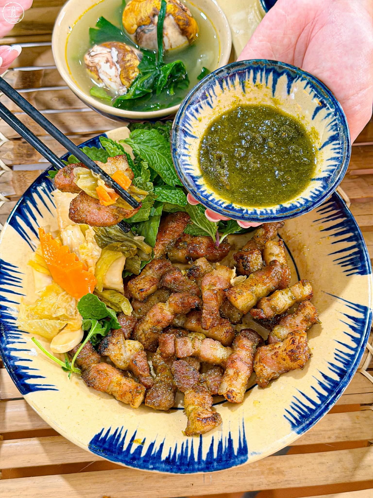Ba chỉ nướng vàng cạnh nhìn thôi đã thấy hấp dẫn. Gia vị muối Tây Bắc thơm mùi mắc khén đặc trưng nhưng không hề khó ăn nha, muối cay nhẹ, thịt mềm và không bị khô.