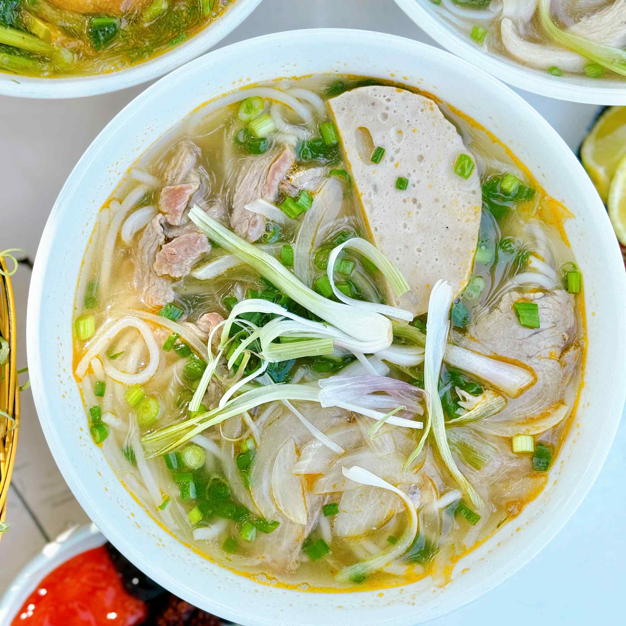 Bún bò có thịt mềm, topping thêm chả bò khá đầy đặn. Nước dùng trong, thanh.