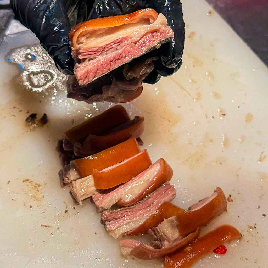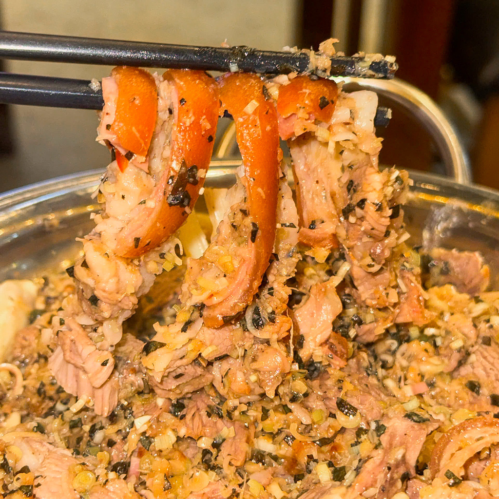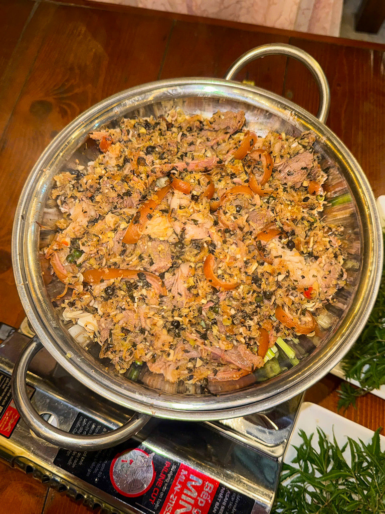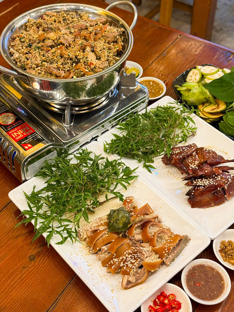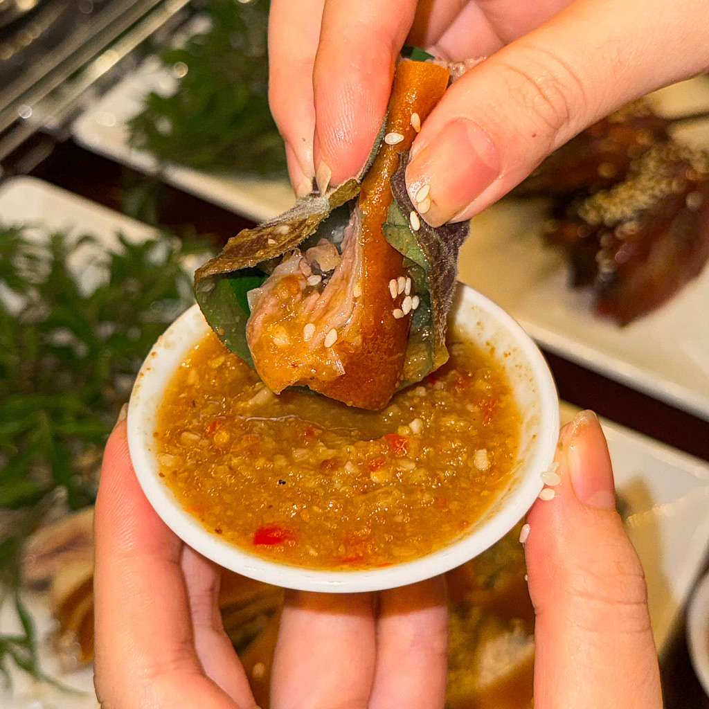• Dê quay : Thịt dê không bị hôi, thịt chắc, da giòn dai, da dê quay giòn, lớp thịt bên trong thơm và vừa vị, không bị khô. Ăn kèm cùng có rau rừng và tương bần hoặc mắm tôm là đúng bài luôn. Đúng là món signature của quán, lần nào tới cũng không thể nào không gọi được.