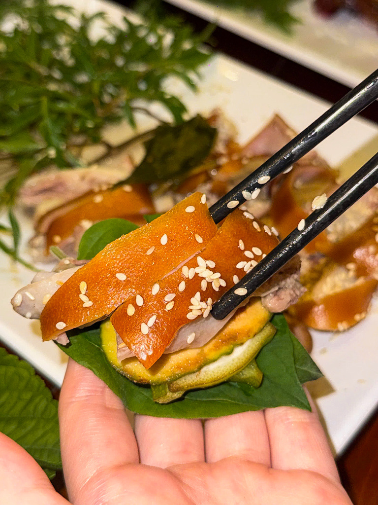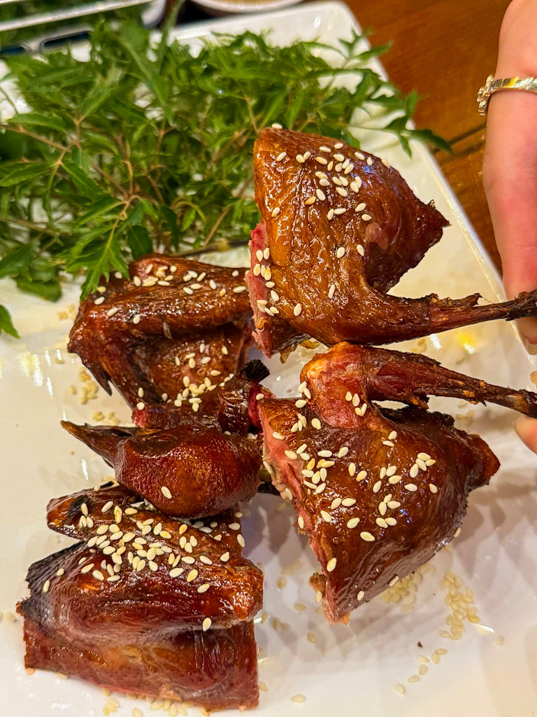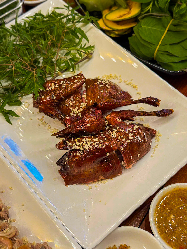 • Chim bồ câu ủ thảo mộc quay giòn : Thịt chim thấm vị thảo mộc, ngọt tự nhiên, lớp da bên ngoài vàng giòn nhìn rất đẹp mắt. Ai mê món quay thì không thể bỏ qua luôn!