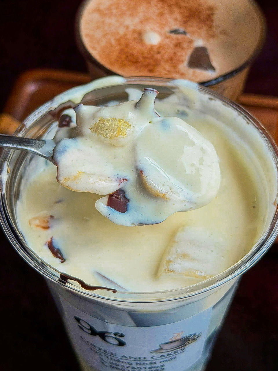 - Sữa chuối socola - món hottrend nổi đình đám dạo gần đây: mình thấy có lớp cốt chuối tươi, socola bóp giòn và đậm gấp đôi, bên trên còn có lớp kem béo được đánh từ whipping cream an toàn cho sức khoẻ + lớp chuối cắt lát kết hợp rất là lạ mà cuốn lắm nhen, uống không hề bị ngấy tí nào!!