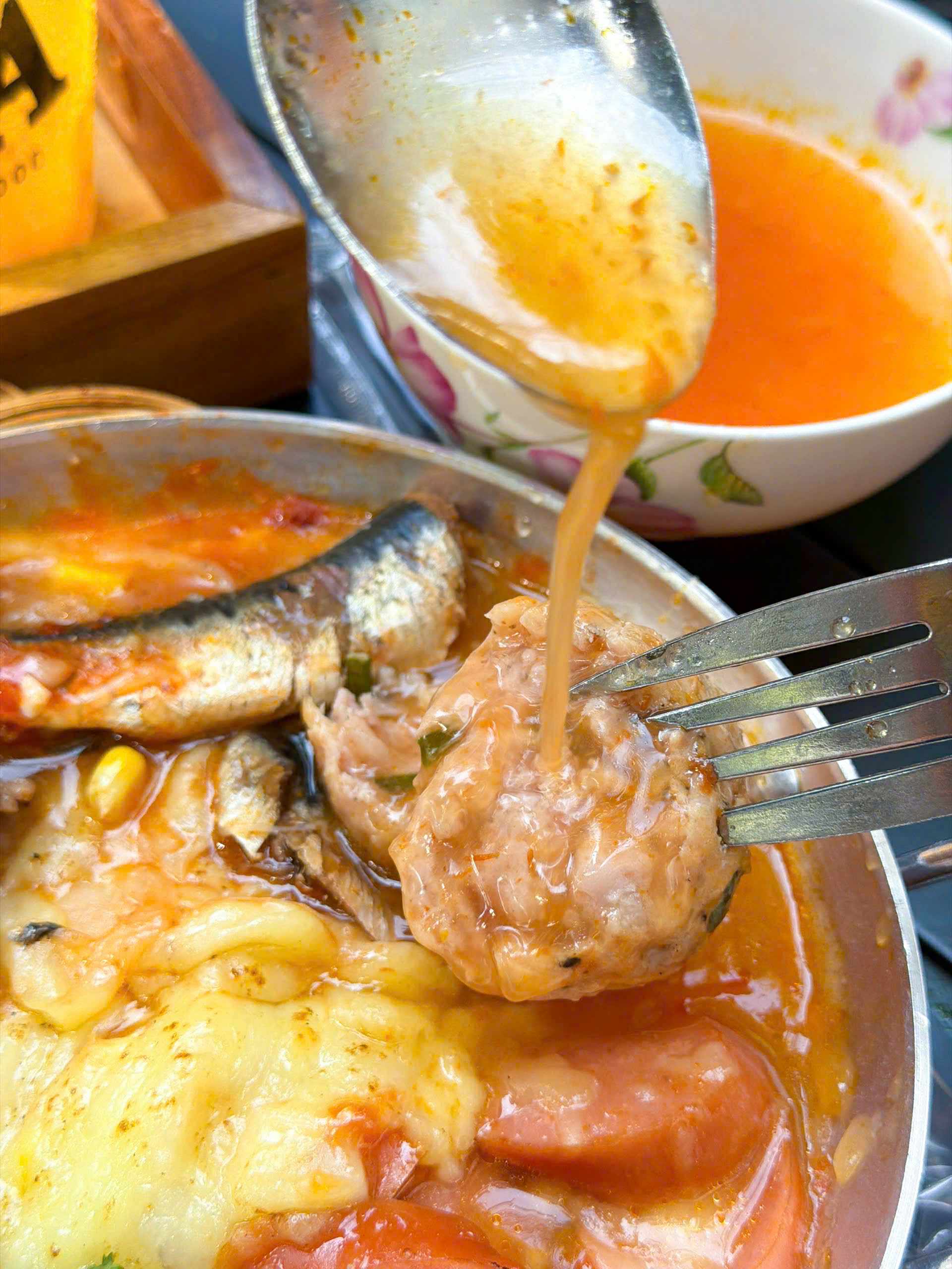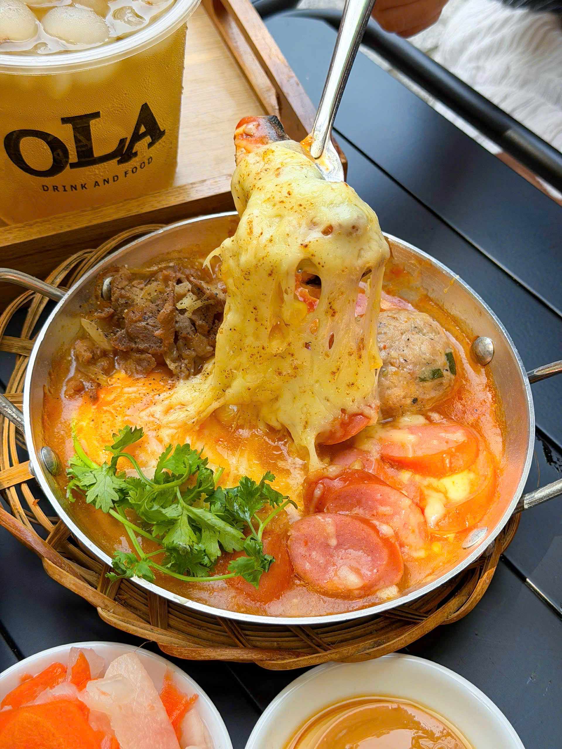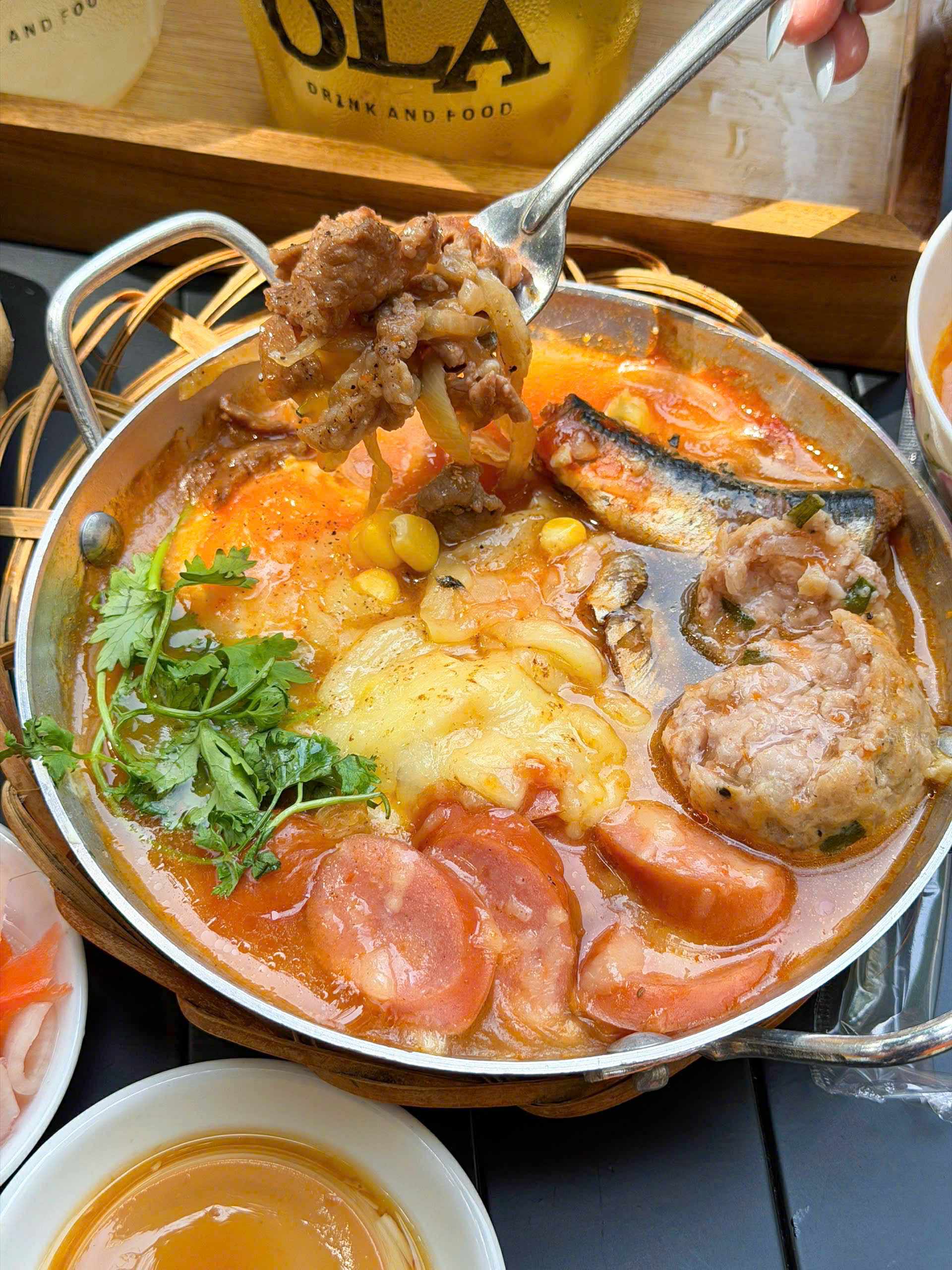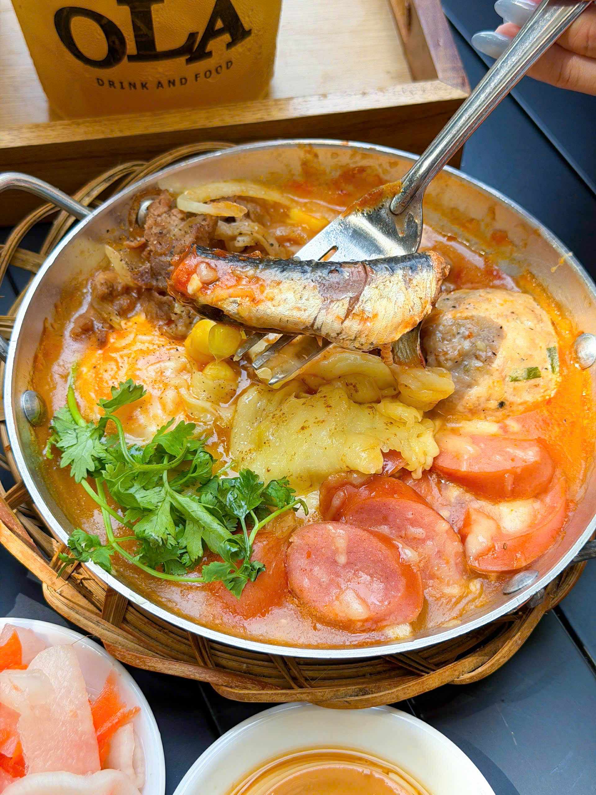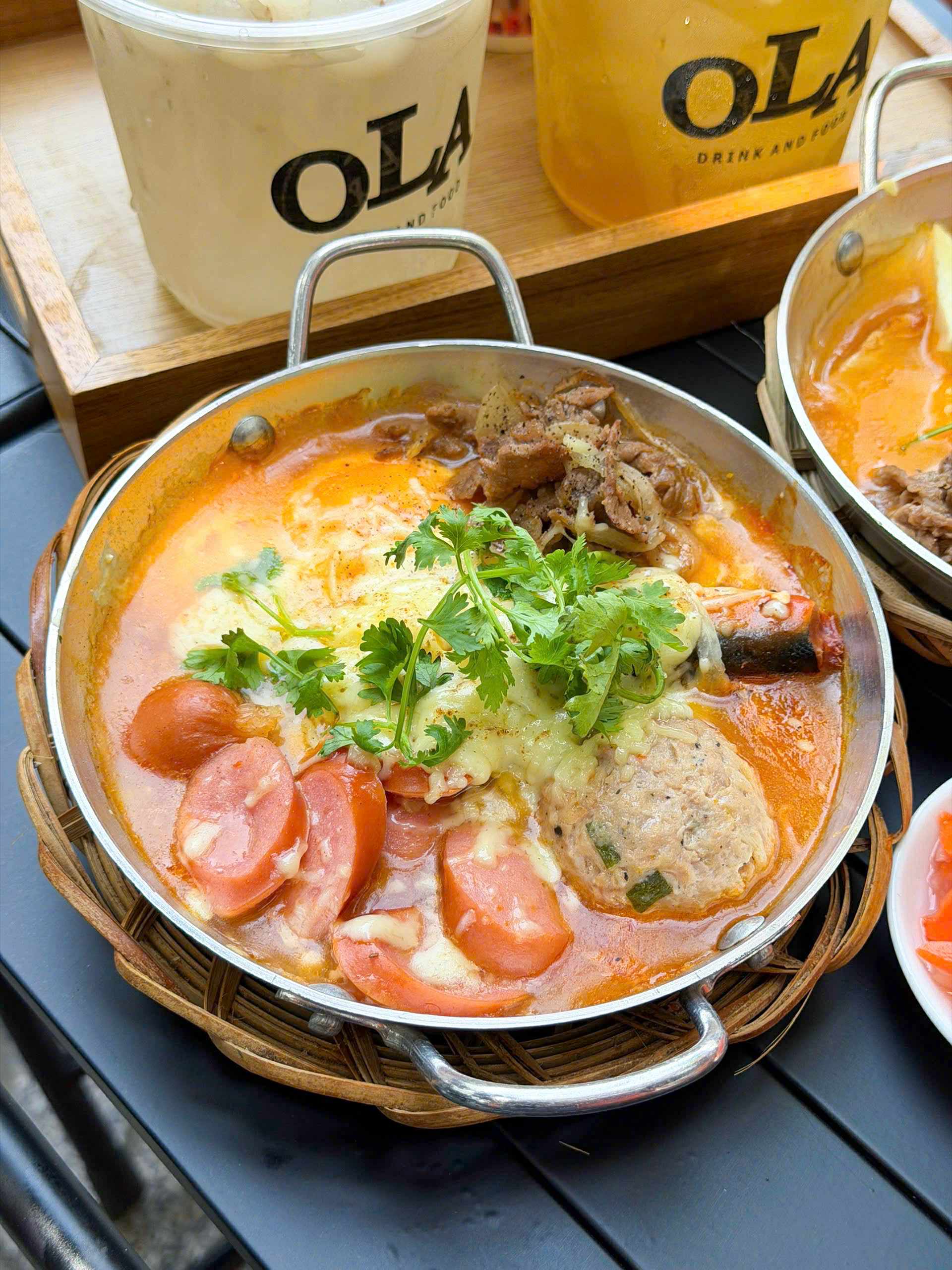 Menu quán có nhiều combo khác nhau, đầy đủ từ trứng, bò, thịt viên, xúc xích… mà giá thì vô cùng học sinh, sinh viên thôi nè. Riêng tui lần nào cũng phải ord chảo thập cẩm ăn mới đã cái nư được áaa. Phần chảo bưng ra còn sôi xèo xèo, thơm nức mũi! Nước sốt quán tự làm từ cà chua, nếm nếm rất đậm đa,hợp khẩu vị, chấm với bánh mì giòn rụm là "nhức cái nách". Topping thì ê hề từ: bò, xíu mại to đùng nhà làm, xúc xích Đức xông khói, cá hộp, phần đặc biệt còn có phô mai béo ngậy tan chảy nữa chứ. Mlem xỉu!