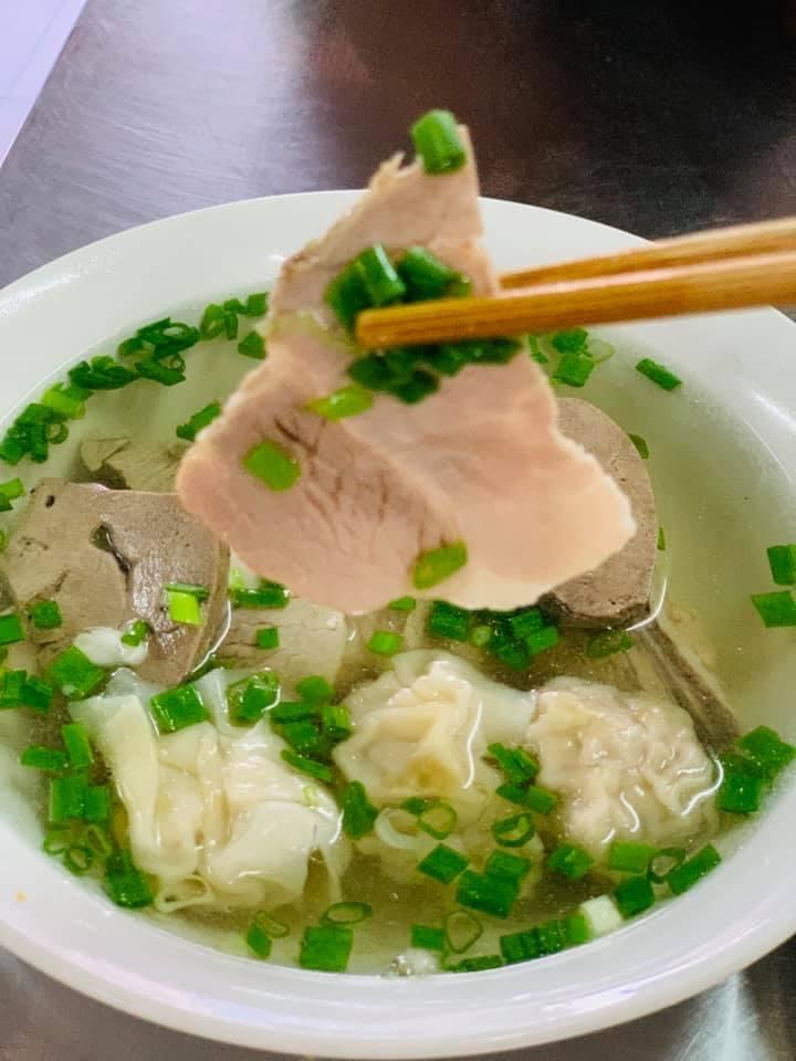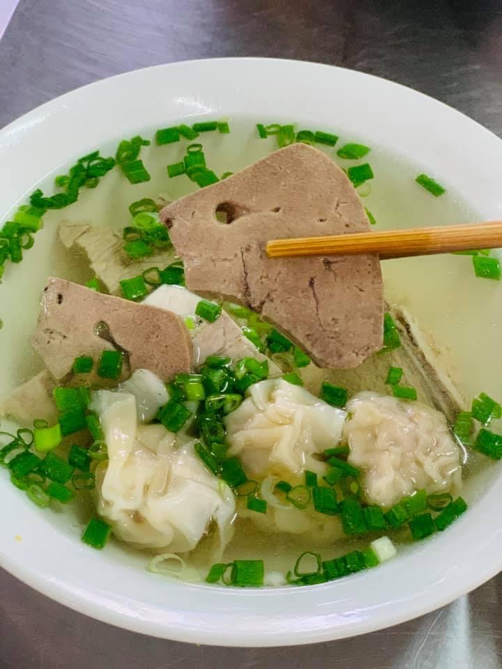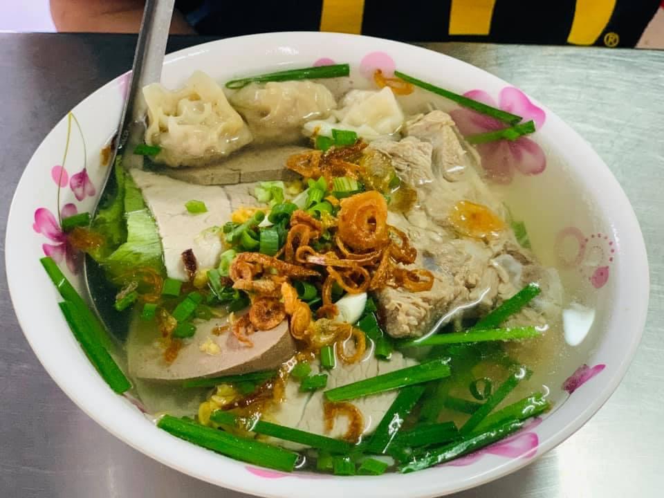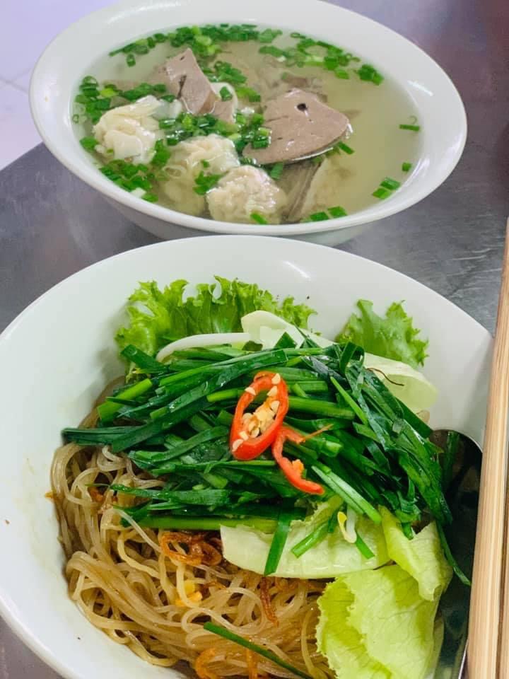 Mình gọi hủ tíu đầy đủ, 1 tô khô, 1 tô nước cho thằng bạn. Tô mang ra hết hồn