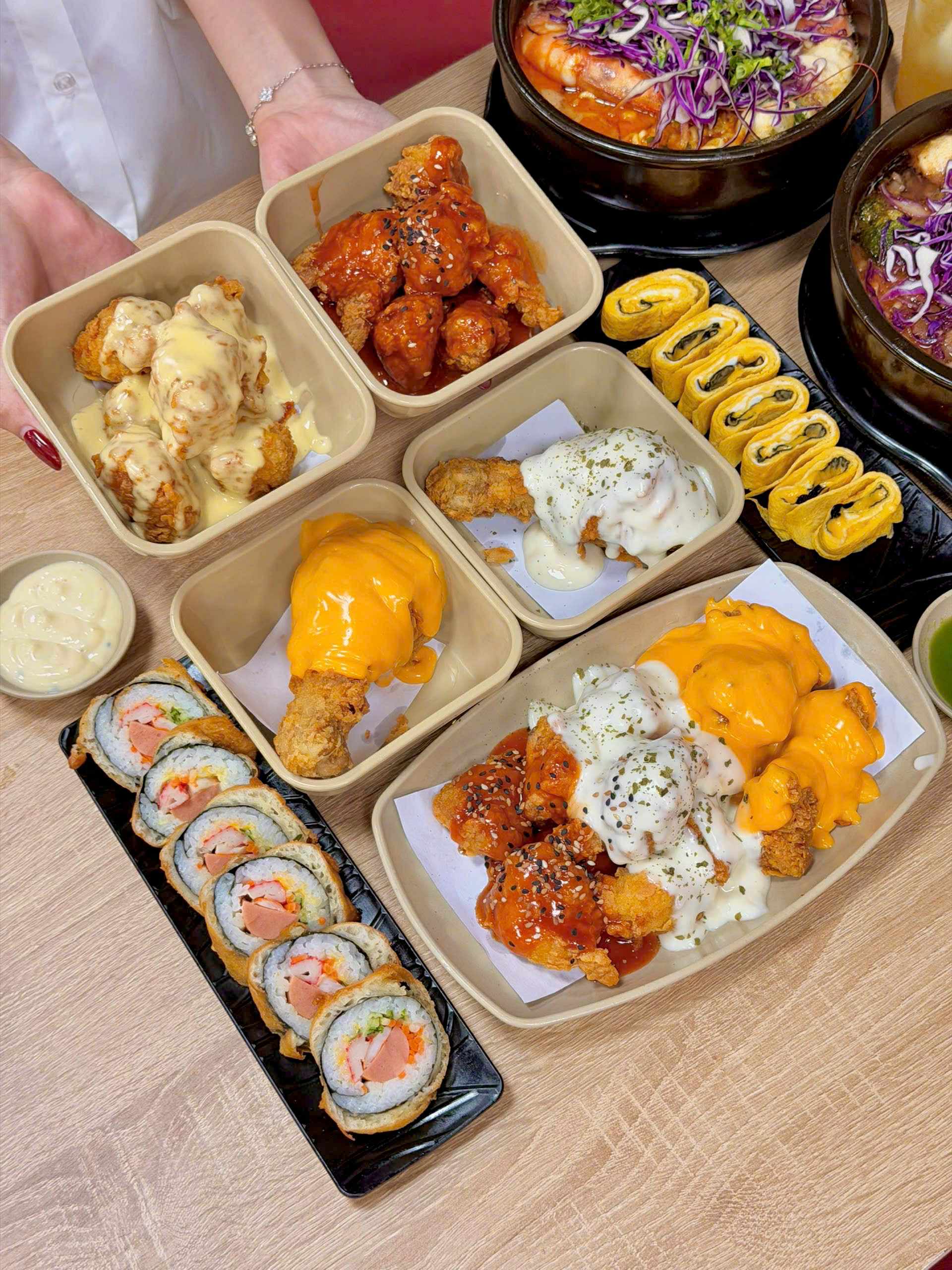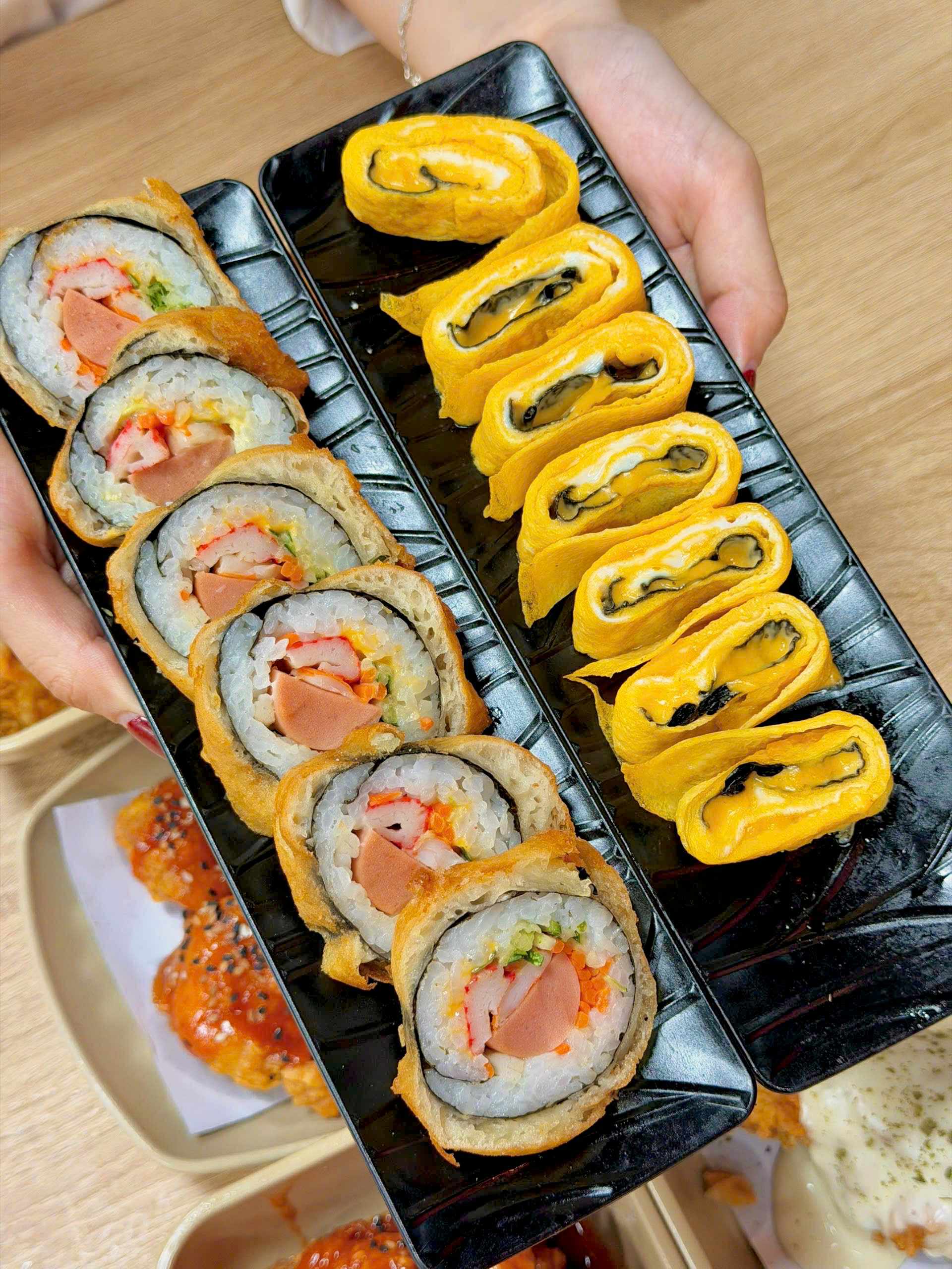 Còn có cơm cuộn kimbap và trứng cuộn rong biển, nhìn nhỏ nhỏ mà ăn kèm lại hợp vị dã man. Gọi ra một bàn là kiểu combo Hàn – Việt hoà quyện, vừa ngon vừa đẹp.