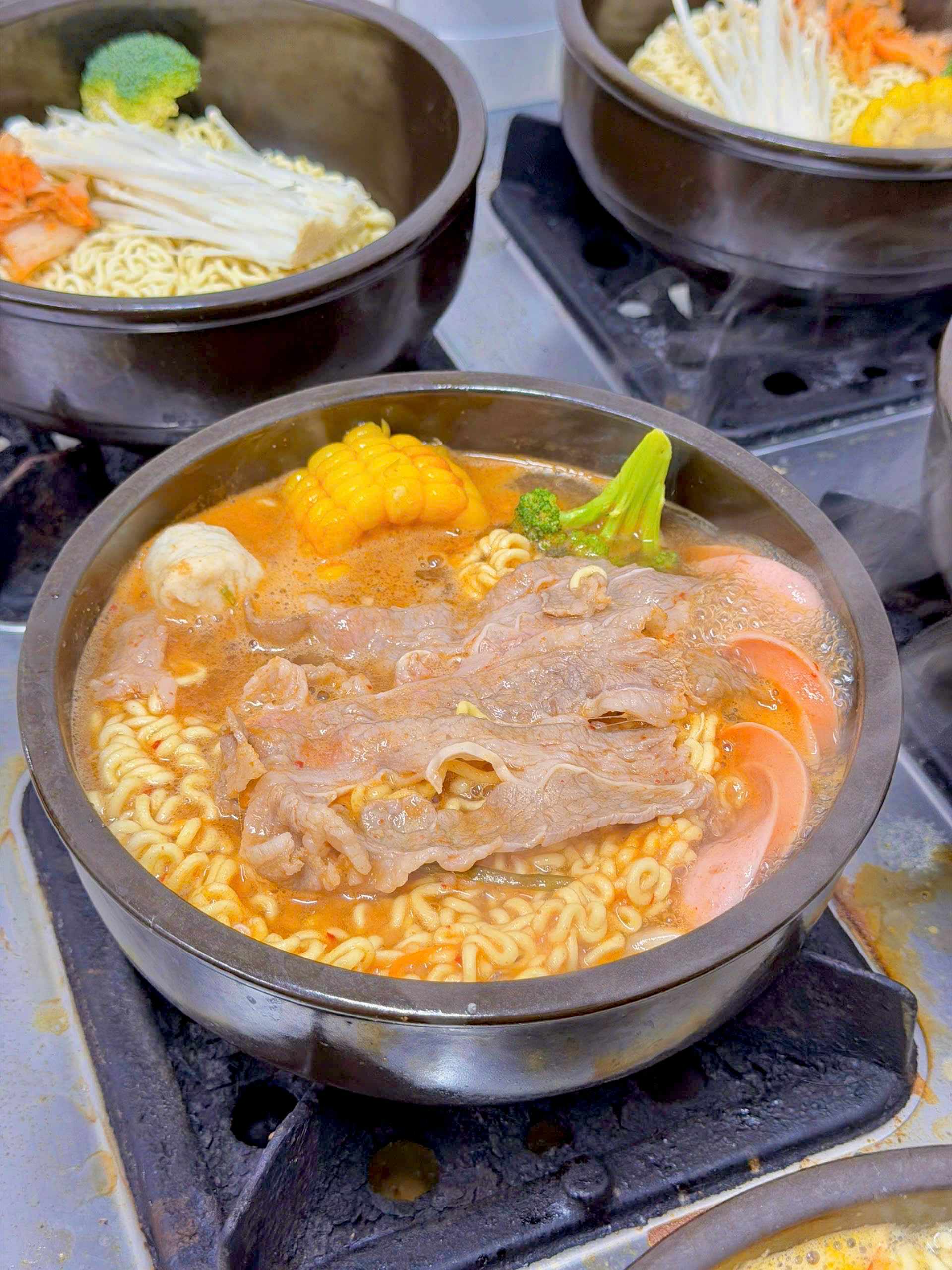 Ngoài gà thì team mình gọi thêm mì cay bò (bò, xúc xích, cá viên) và mì cay Tomyum thập cẩm (tôm, mực, bò, xúc xích, cá viên) – nước mì cay thơm nồng, sệt nhẹ, ăn cuốn cực kỳ. Ai mê Tomyum chua cay kiểu Thái là quắn quéo luôn!