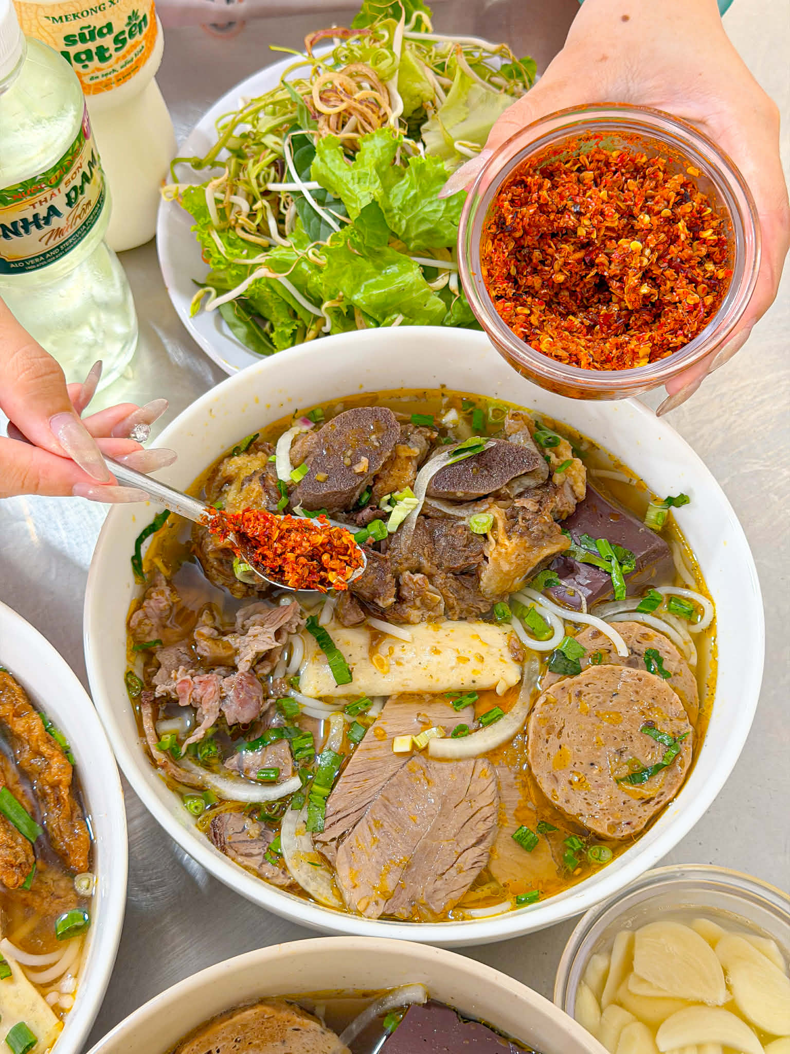 Ai ăn nhiều như tui phải order ngay 1 tô bún bò đặc biệt (60k): mê nhất miếng sườn bò to, nhiều thịt thơm mà mềm rục. Bắp vs nạm cắt miếng to, thịt hầm mềm, chả Huế thơm dai; bò viên dai chất lượng lắm, huyết ở đây là huyết bò ăn vô là thấy chất lượng liền. Nước lèo mới là chân ái: đậm đà, thơm mùi sả, ngọt từ xương nên không bị gắt. Thêm tí sa tế với ớt, ăn kèm rau sống là bùng vị liền.