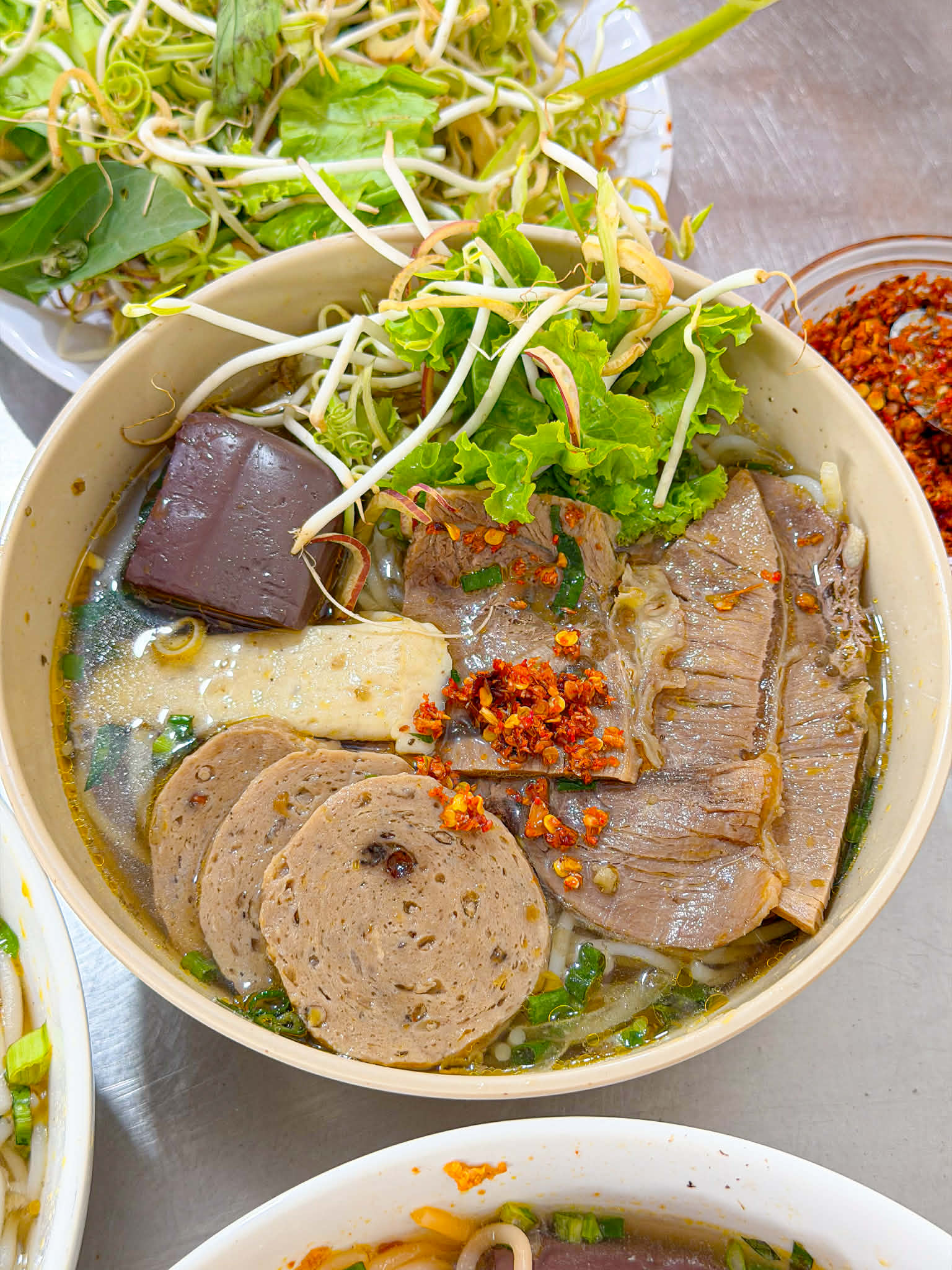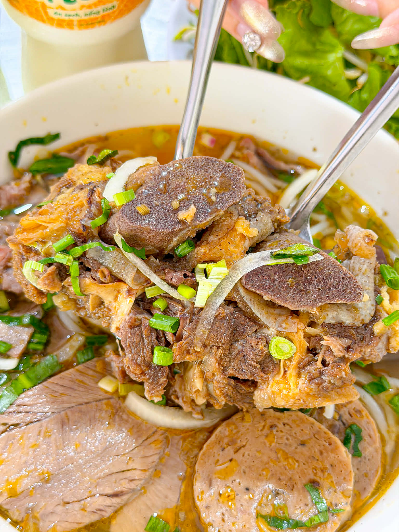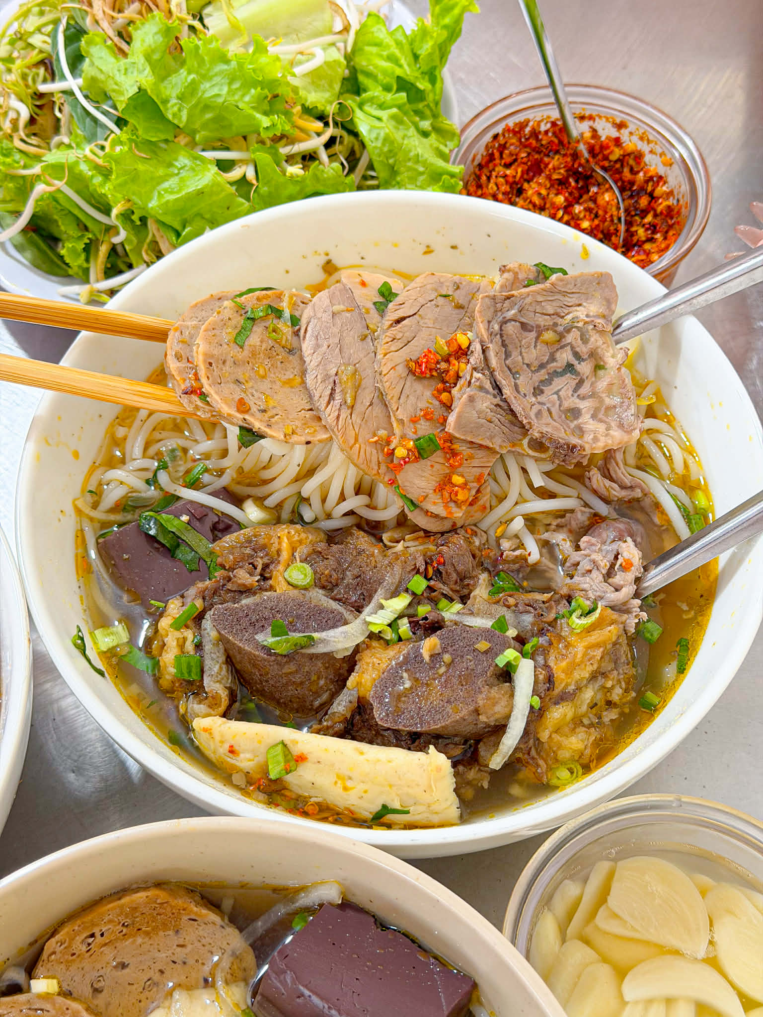 mà topping cũng ngập lắm á nào là nạm, bò viên, chả Huế, huyết bò, ăn đã miệng luôn.