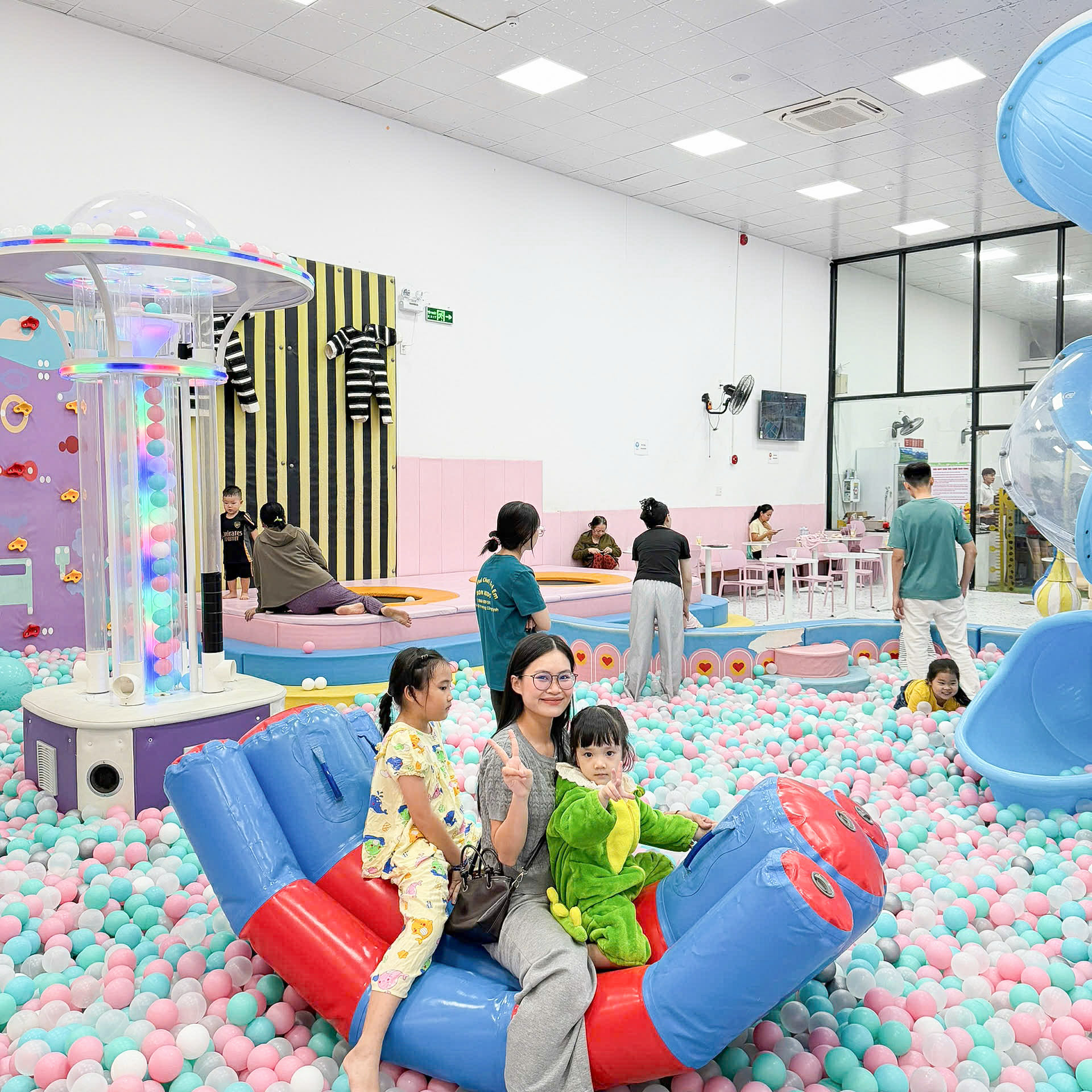 . Không gian được thiết kế nhiều màu sắc, sạch sẽ và an toàn nên ba mẹ yên tâm cho bé vui chơi thoải mái nha