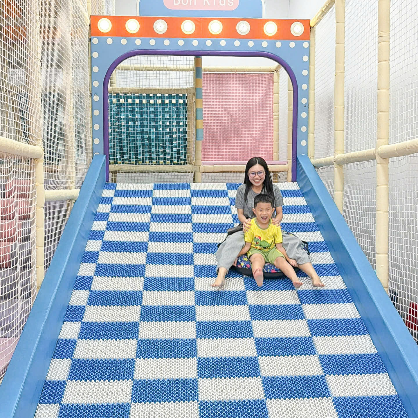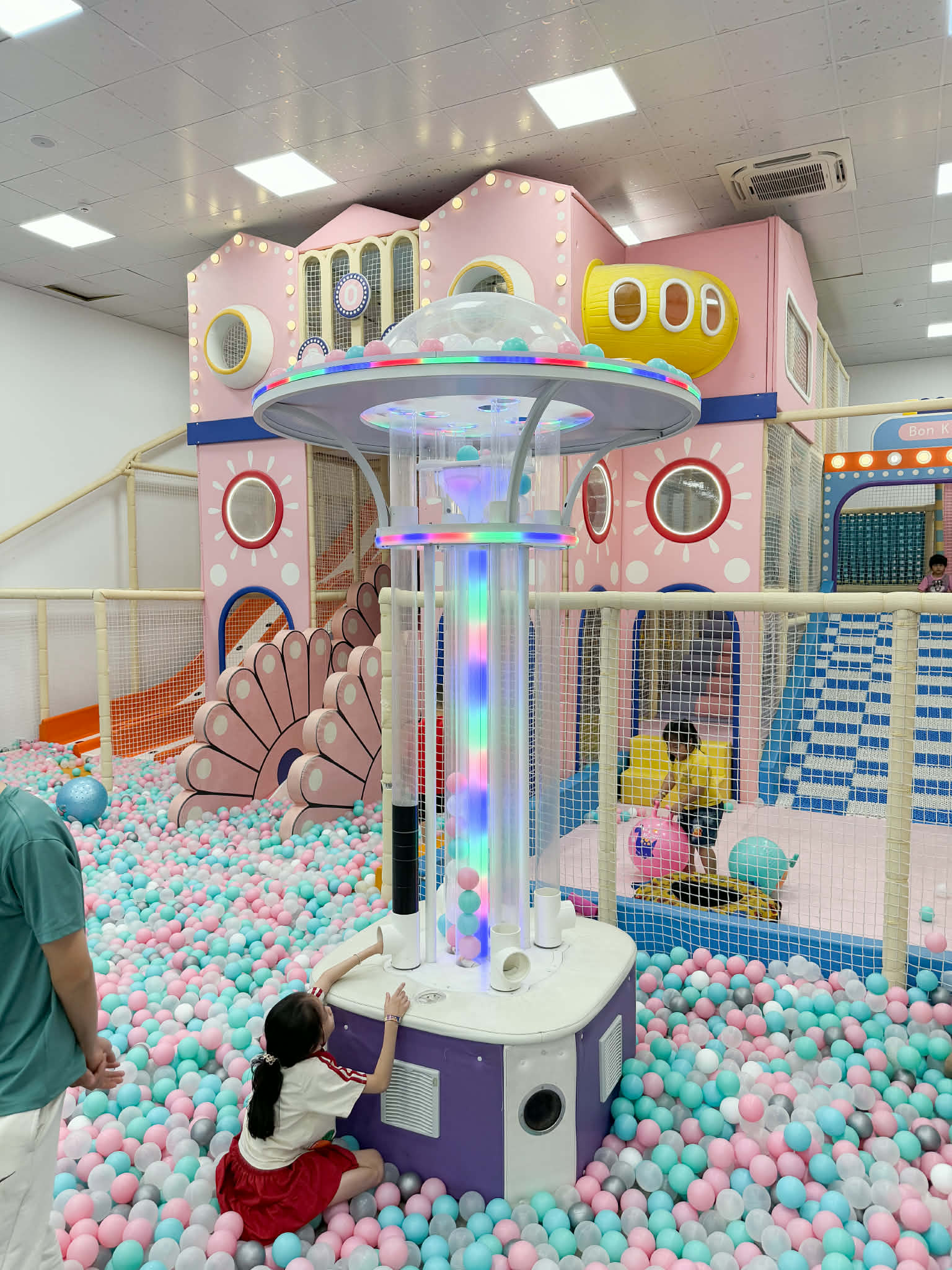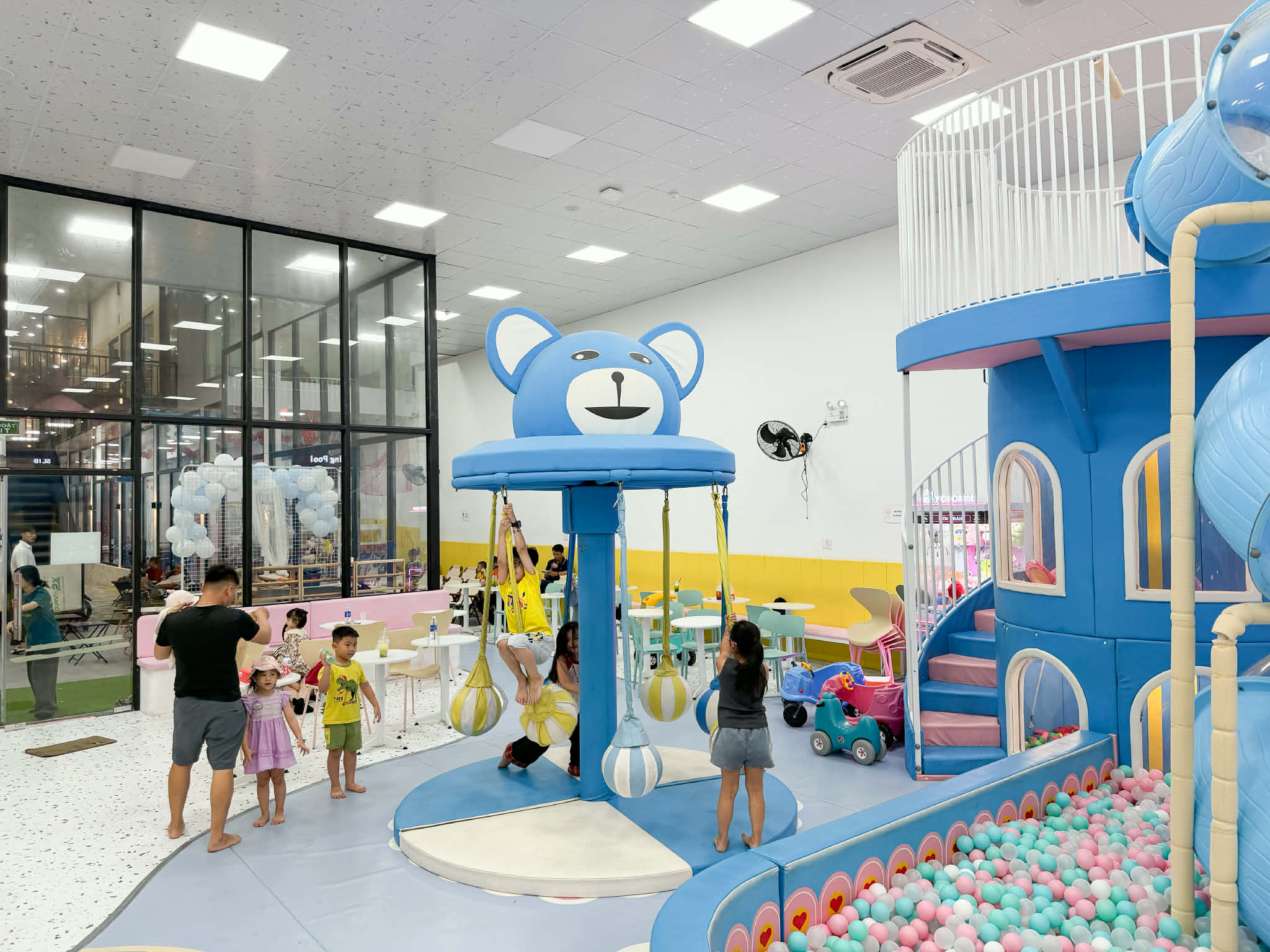 Bên dưới là khu vui chơi trong nhà rộng rãi với nhiều trò hấp dẫn như cầu trượt, nhà banh, trượt phao, câu cá và các phòng mô phỏng như bác sĩ, nấu ăn, công chúa