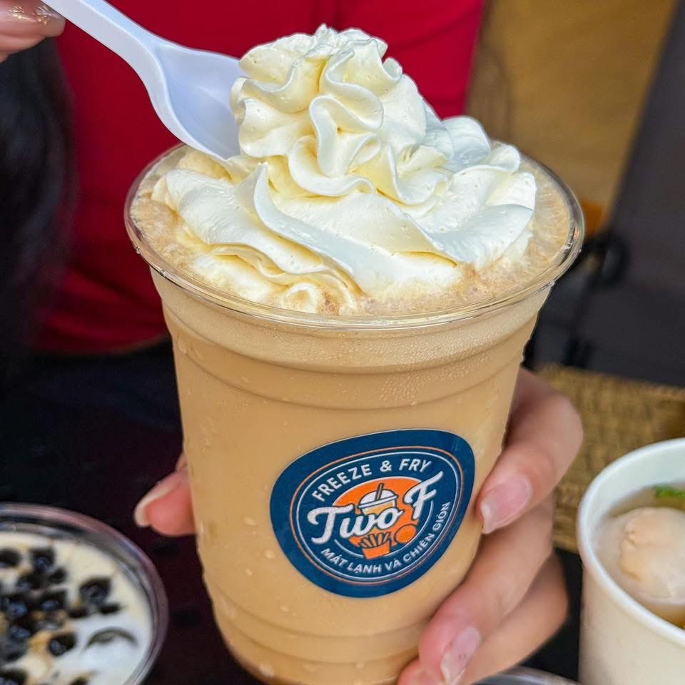 Frappuccino Caramel – 42 xu: Món này chủ lực nè, kiểu dạng đá xay á mọi người. Bên trên có lớp kem béo ngọt, phần đá xay thì quyện cafe, caramel, sữa rất thơm, ngọt nhẹ, uống mát lạnh cực đã luôn🫶