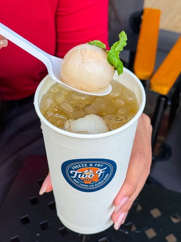 Trà Olong Vải – 32 xu: Ly này có vải tươi nè. Bạn nào thích uống thanh mát, giải nhiệt thì gọi món này nha.