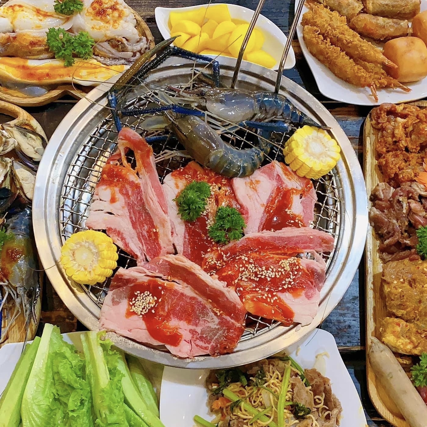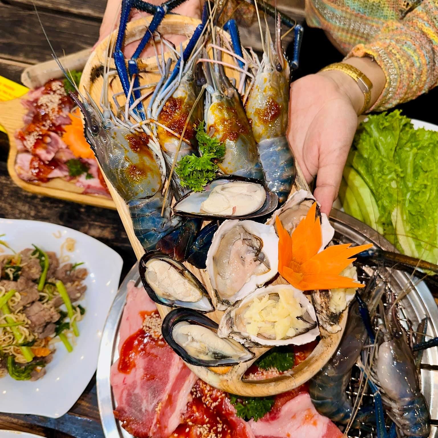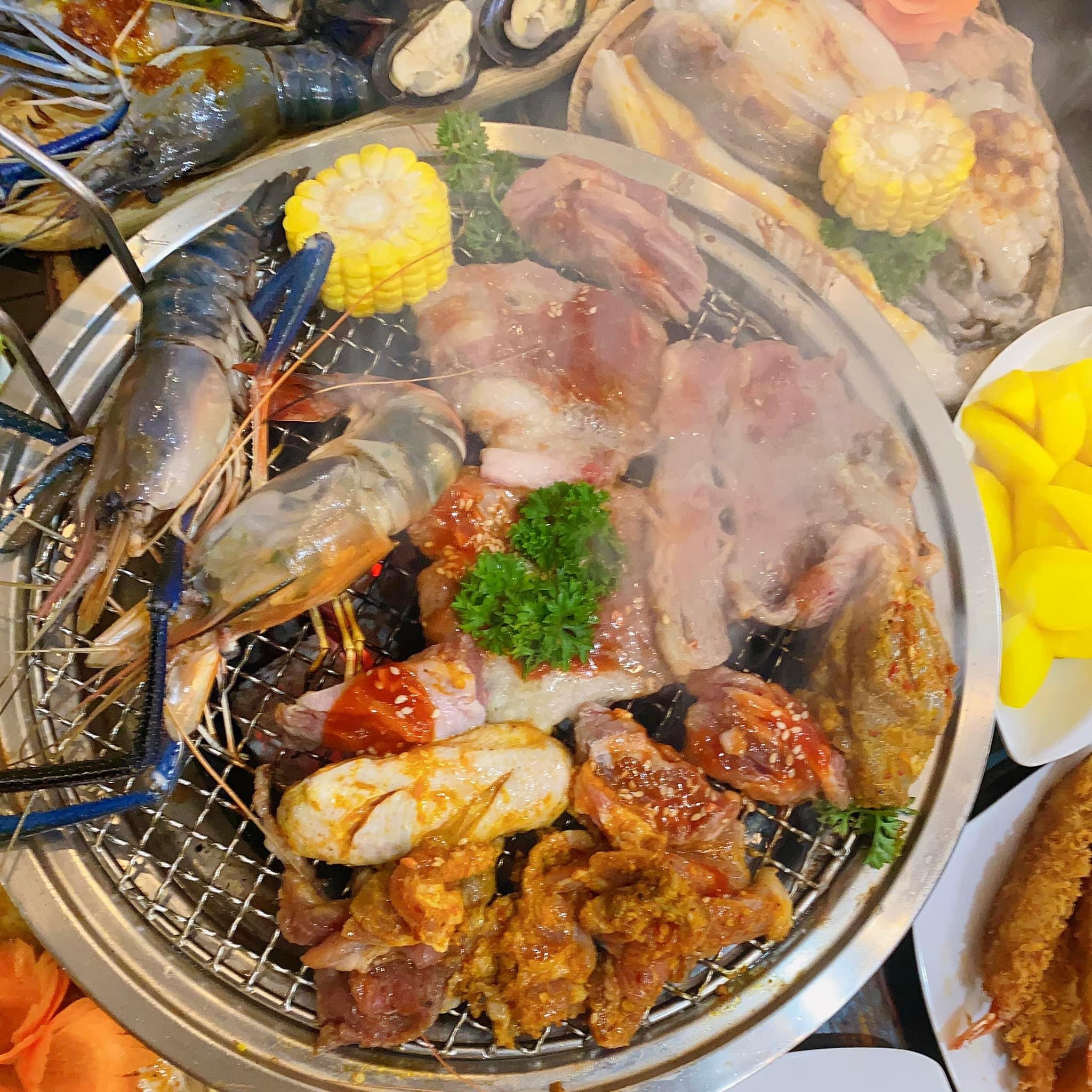 Quán có nhiều gói buffet, mọi người có thể lựa chọn nha, giá yêu thương chỉ từ 169k thui. Nếu muốn ăn nhiều loại hải sản và lẩu thì mọi người chọn gói 298k như bọn mình. Gói buffet nhóm bọn mình chọn có những món như: Đà điểu sốt sa tế Đài Loan, canh gà sốt Satay (Mã Lai), dồi sụn, nai sốt tiêu xanh, sườn sốt thái, tôm càng xanh, mực, cánh gà, sườn cọng, ba chỉ bò, hàu, vẹm xanh,.....& lẩu thái nữa nè. Món ăn thì khá hợp khẩu vị của mình, món nướng ướp vừa vị, hải sản tươi, sốt chấm kèm khá ngon, có sốt phô mai và trứng muối nữa, sẽ hợp với những bạn nào thích vị béo như mình nha. Ăn uống no say căng bụng luôn đó