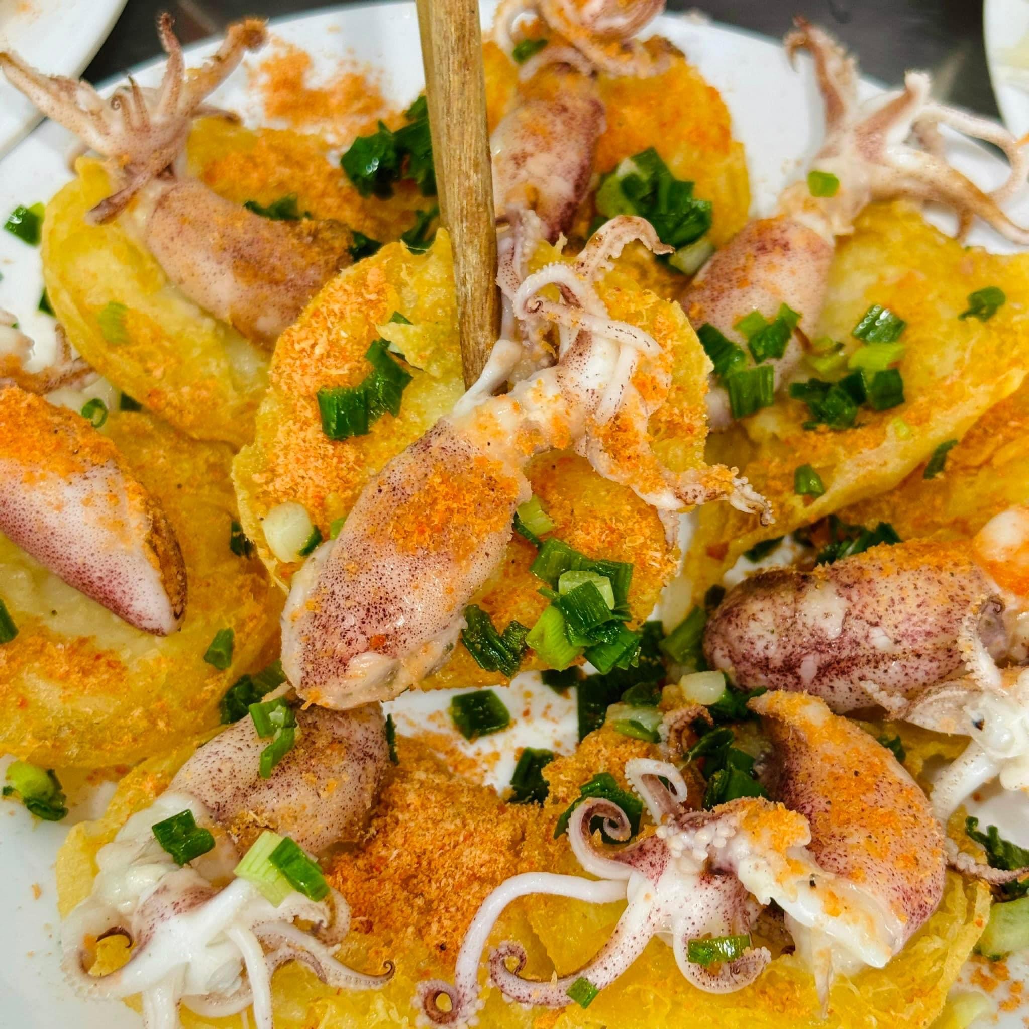Quán Long Bánh Khọt chỉ có 2 loại nhân bánh: nhân tôm & nhân mực. Tôm và mực quán bán khá to, tươi ngon lắm. Bọn mình order 3 phần: tôm, mực & thập cẩm. Sau khi order bánh thì quán mới bắt đầu xay bột bánh và bắt đầu chiên bánh chứ không làm bột sẵn hay bánh sẵn. Order bao nhiêu thì quán chiên bánh bấy nhiêu nên đó là điểm mình thích nhất ở quán. Mình chịu khó đợt xíu, cũng không quá lâu, tầm 10-15 phút nhưng lại có phần bánh ngon thì cũng chịu khó đợi nha.