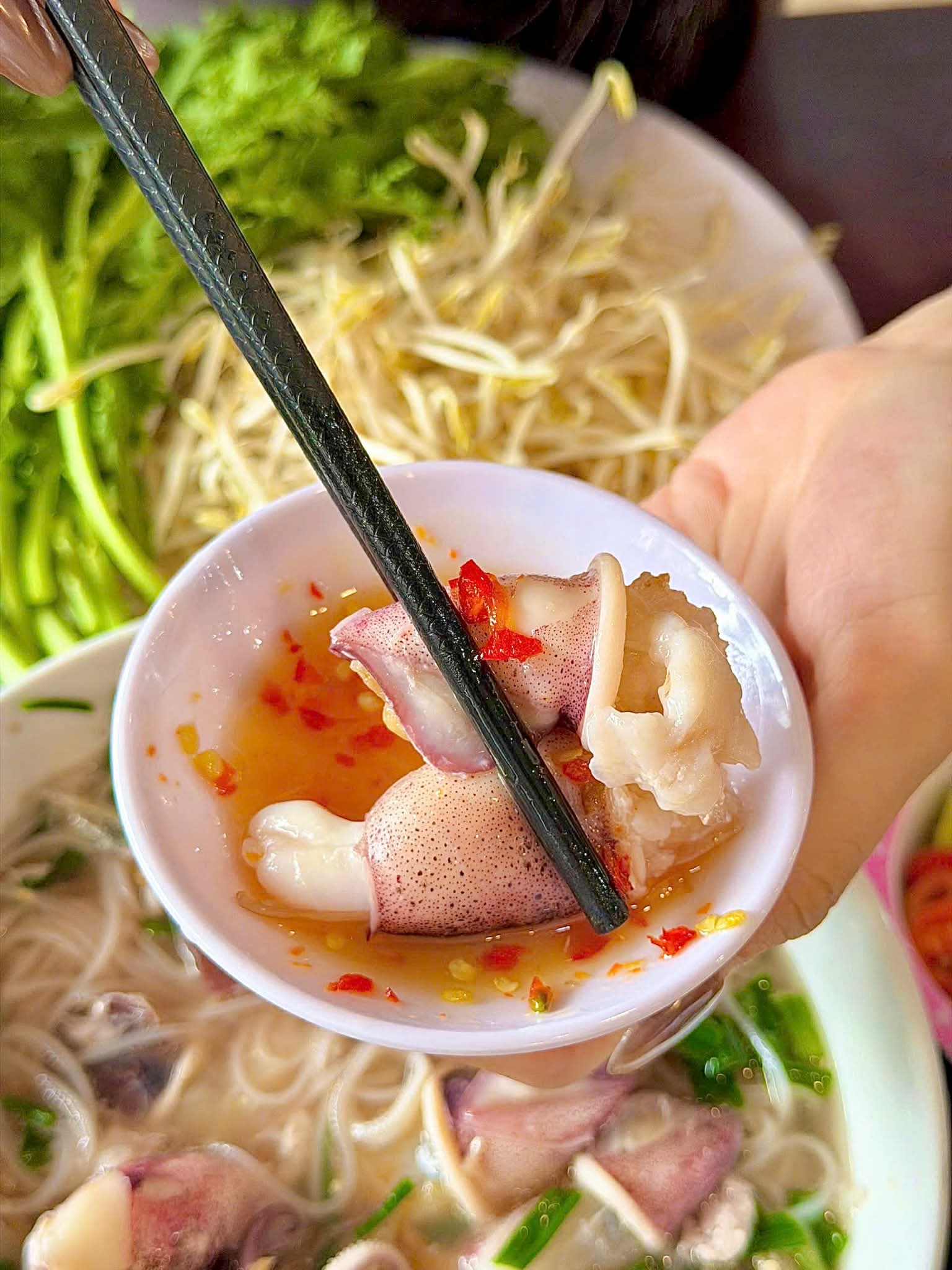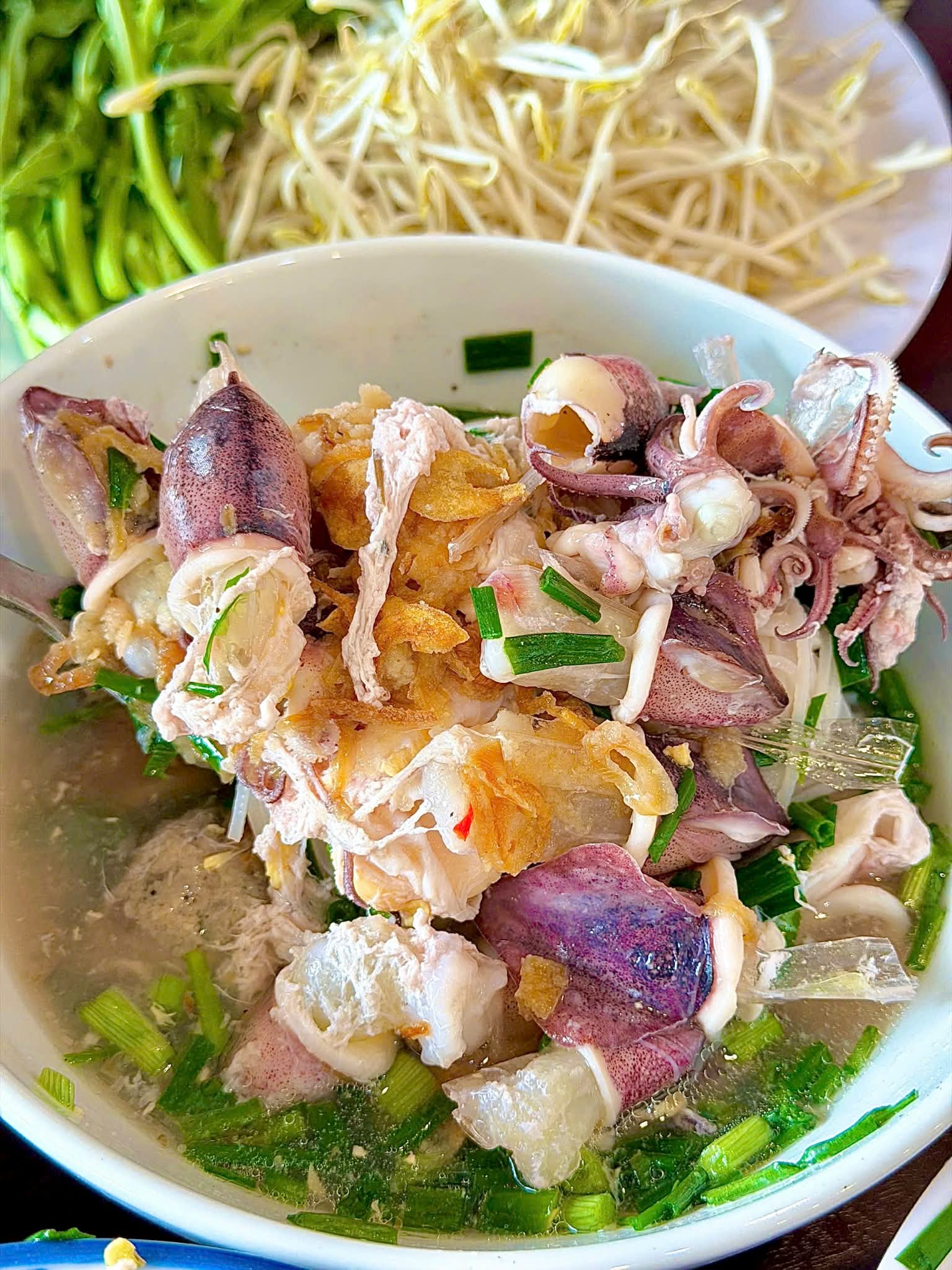 🦑 Hủ tiếu mực – món “signature” của quán. Tô bưng ra nhìn là thấy đã mắt với mực tươi cắt khoanh to, giòn sật sật. Đặc biệt ở đây còn có mực trứng béo béo ăn rất lạ miệng. Nước lèo nấu trực tiếp từng chảo từ hải sản nên thanh nhưng vẫn đậm vị, ăn kèm rau giá, ớt cay cay là đúng bài luôn.