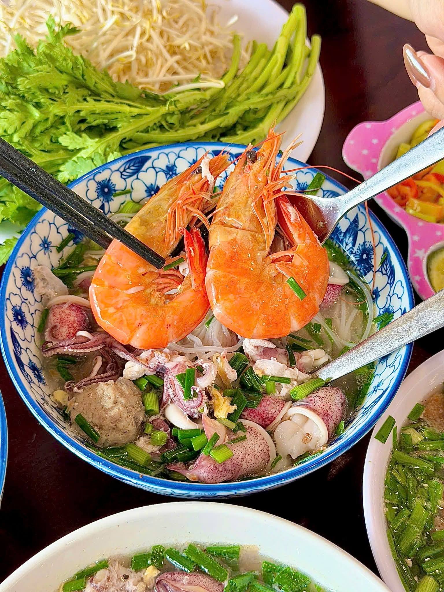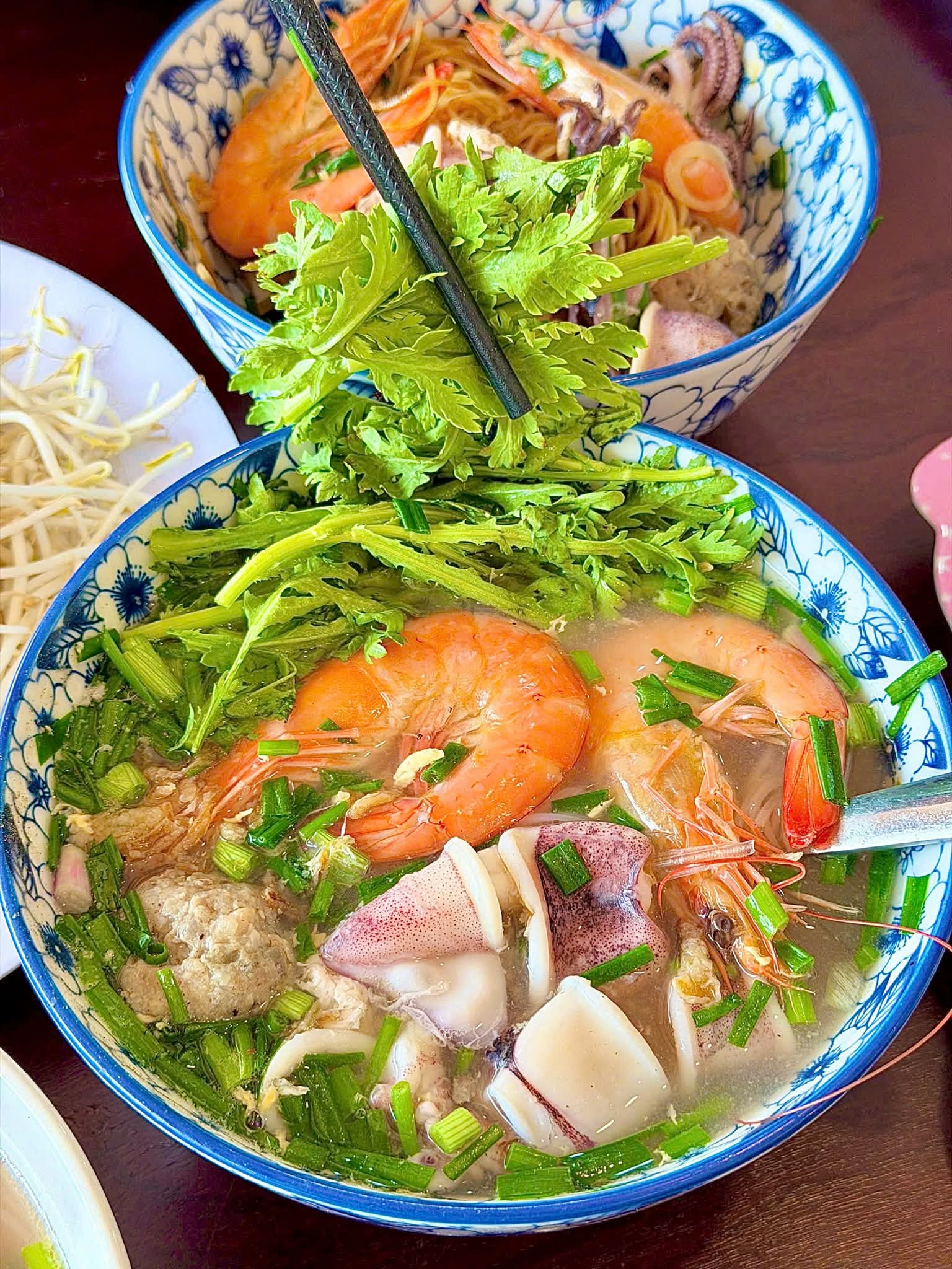 🍤 Hủ tiếu đặc biệt – dành cho team thích topping nhiều. Trong tô có mực, tôm, thịt, viên đầy đặn. Hay ở chỗ mỗi phần topping đều được đong sẵn trong từng bát riêng nhìn rất rõ ràng, đầy đặn. Tôm ngọt, mực giòn, thịt viên dai dai, ăn một tô là no căng mà vẫn muốn húp thêm nước lèo.