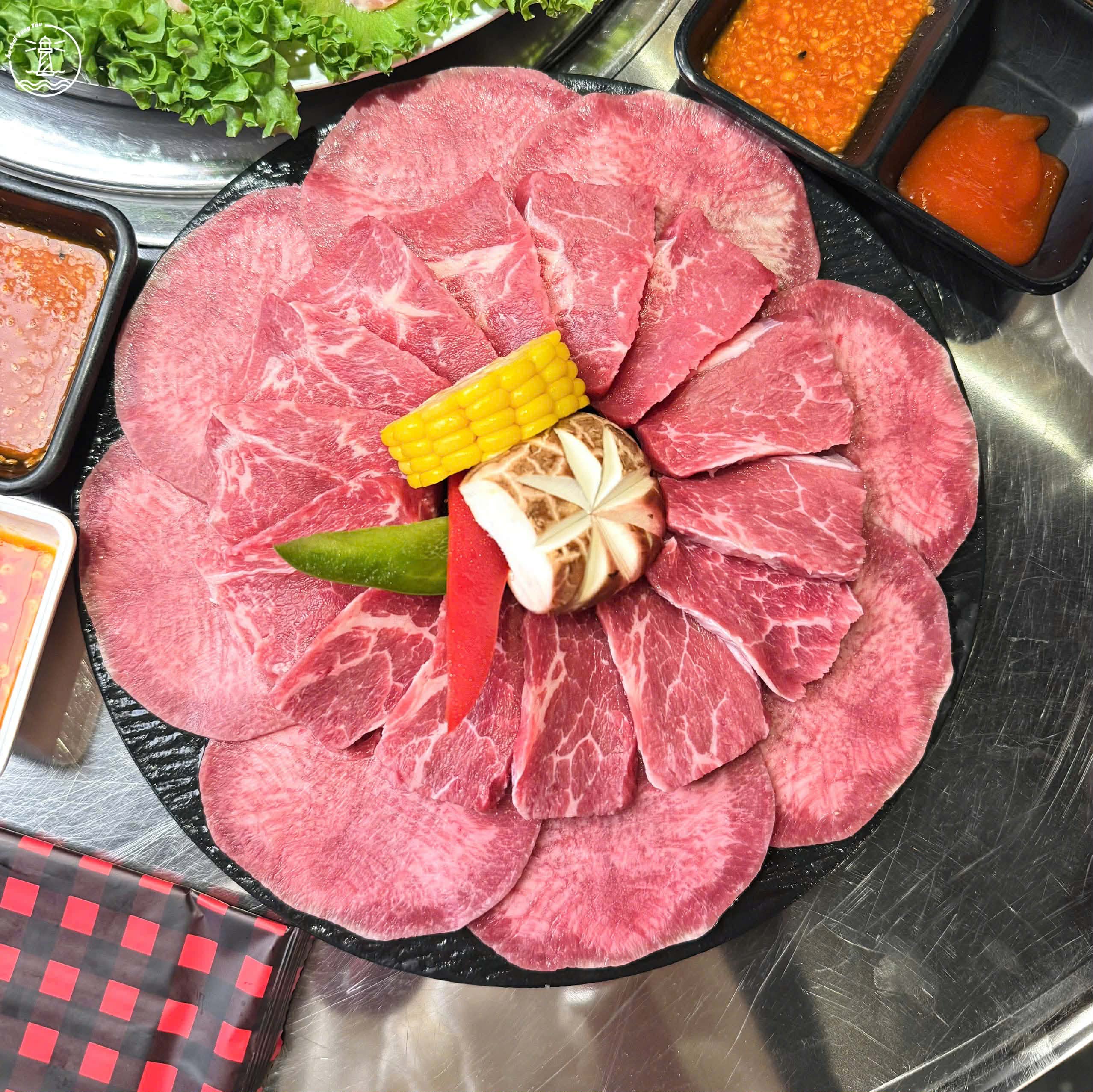 Set bò nướng: Miếng bò dày, mềm, nướng chín tới nên mọng nước cực kì, lưỡi bò cũng được cắt lát mỏng vừa ăn. Ăn kèm có set rau của quán và kim chi