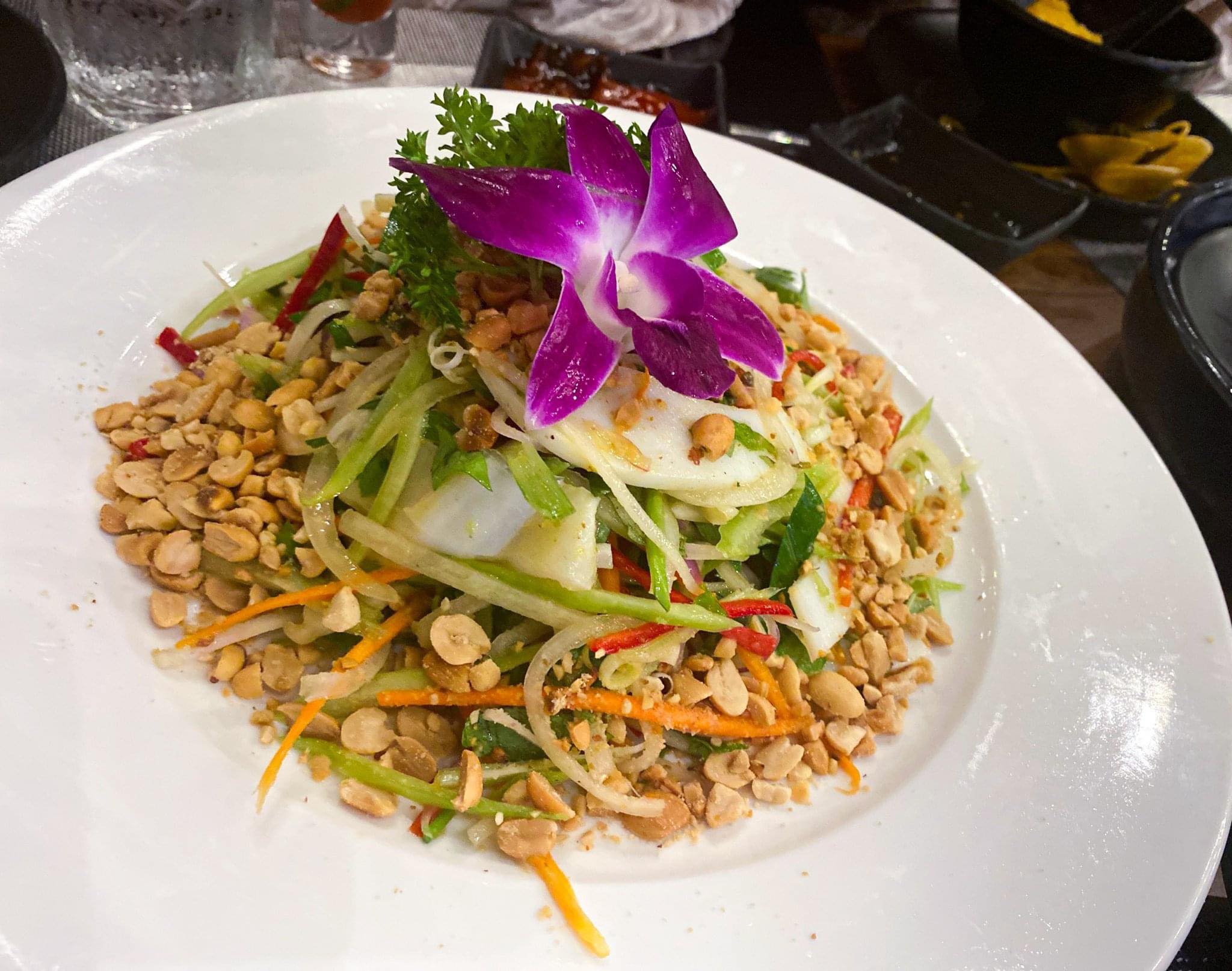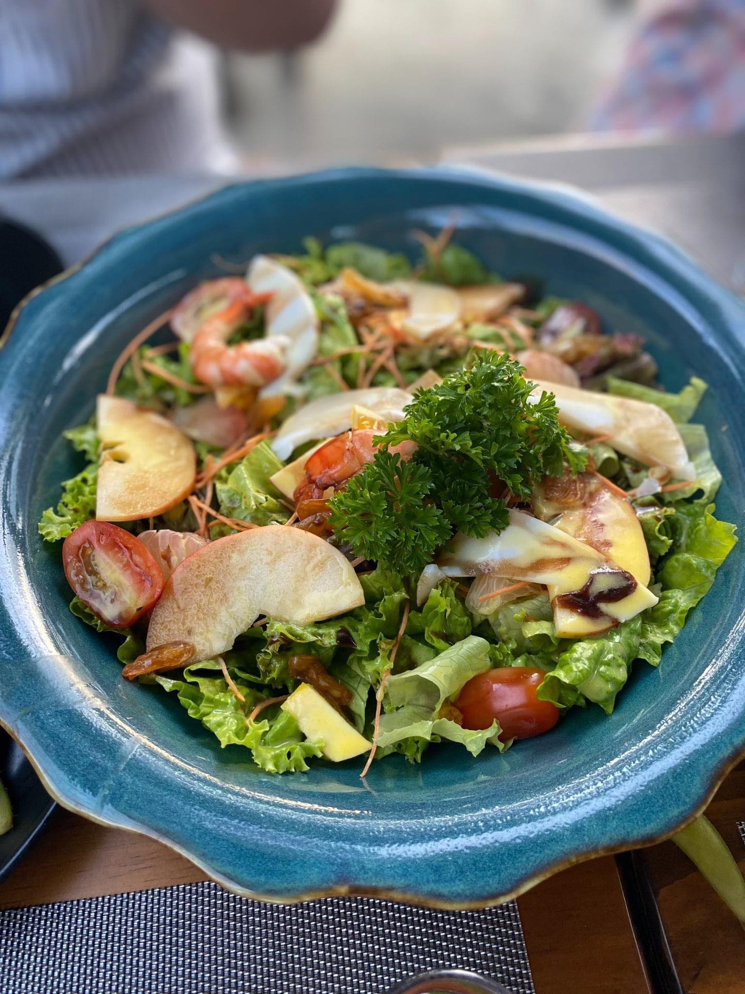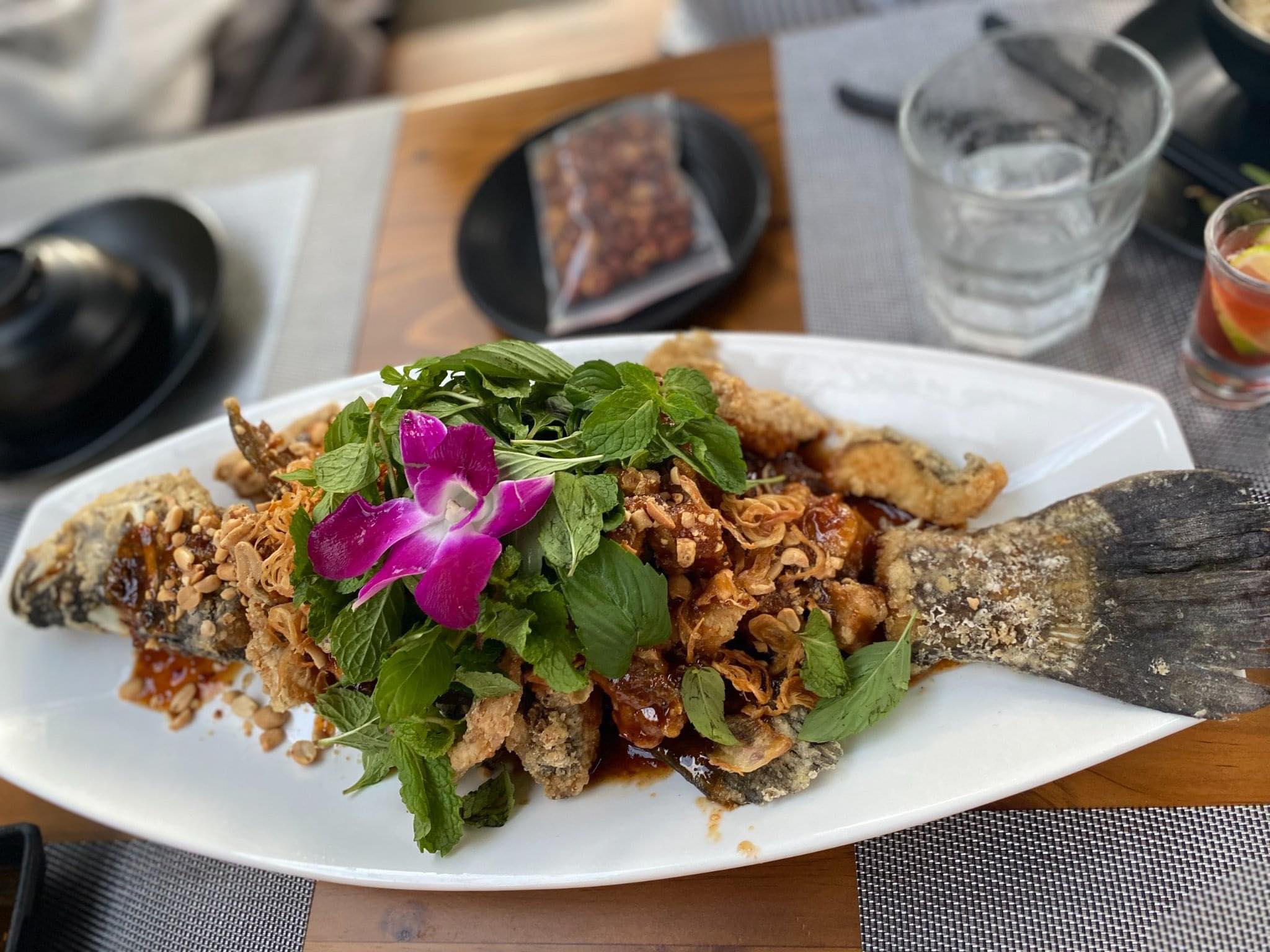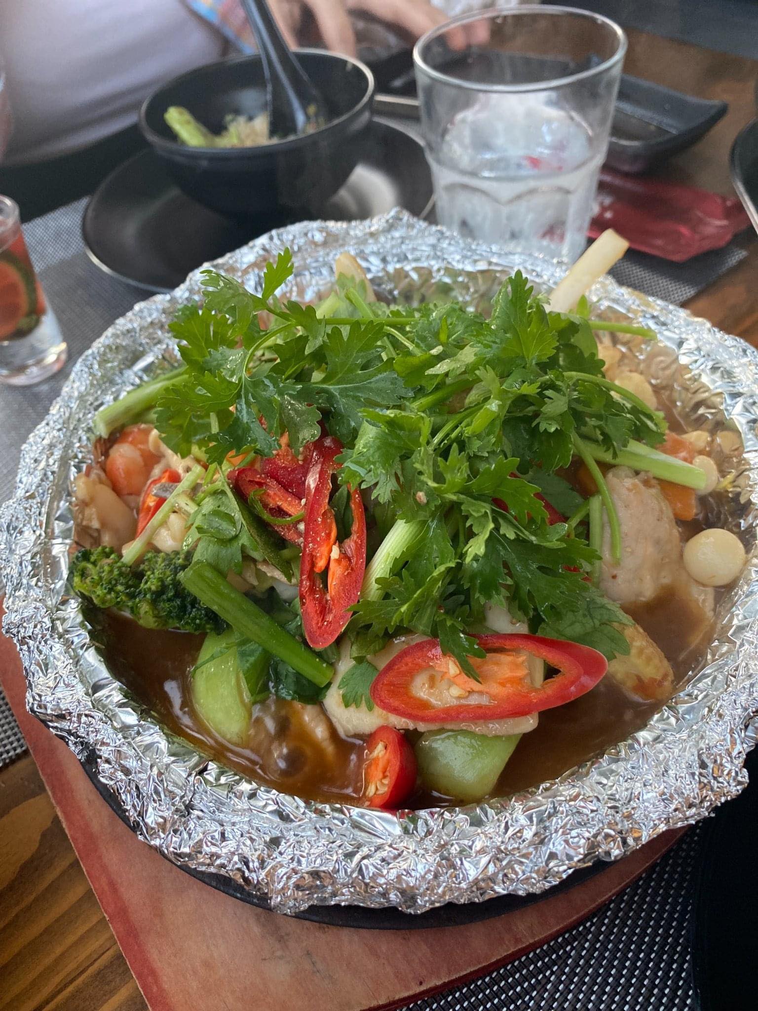 Menu của quán thì đa dạng từ món Âu cho đến món Á, bàn mình gọi khá là nhiều món nhưng mình ấn tượng nhất có lẽ là “Cá Chẻm Sốt Thái” và “Đậu hũ giấy bạc”, một dĩa cá chẻm to đùng được chiên giòn rụm rưới nước sốt ăn cùng vừa ăn mà không cần chấm thêm gì, đậu hũ gói giấy bạc thì nóng hổi miếng đậu hũ non mềm ăn vào thì thơm mùi trứng vị có 1 chút bùi bùi, béo béo.